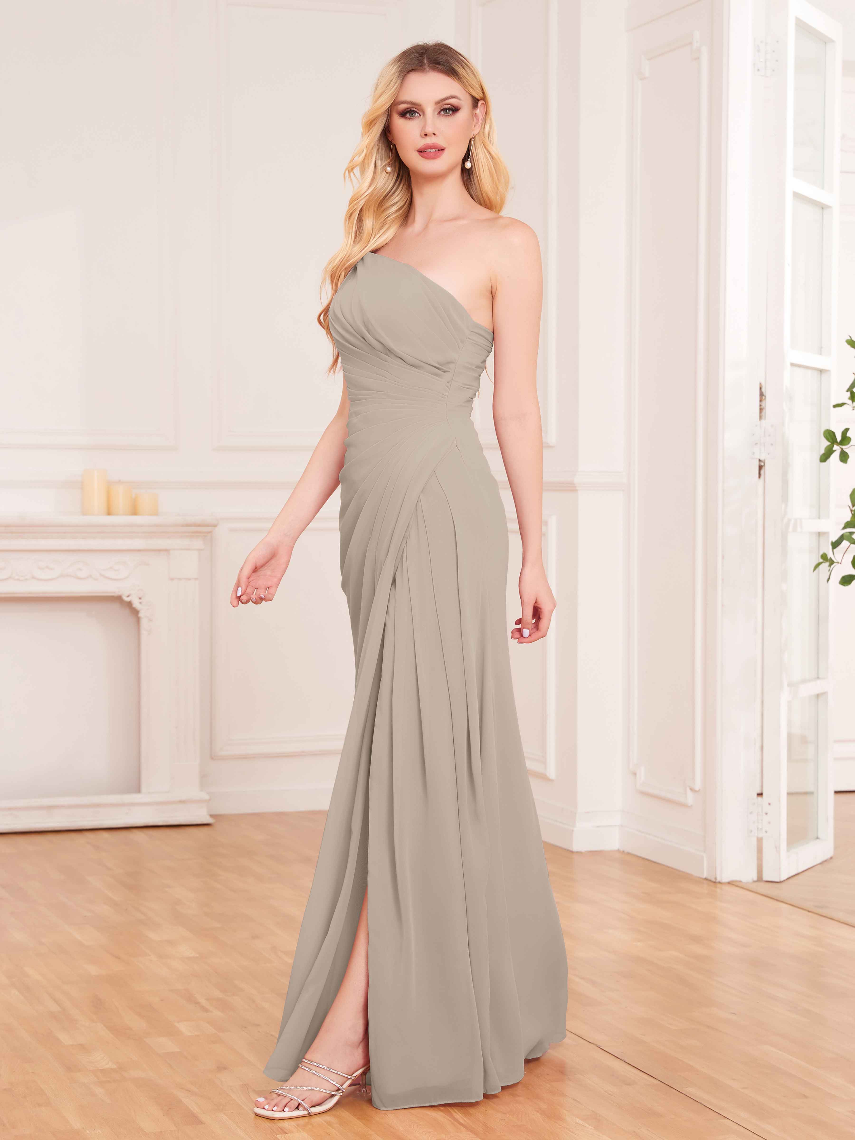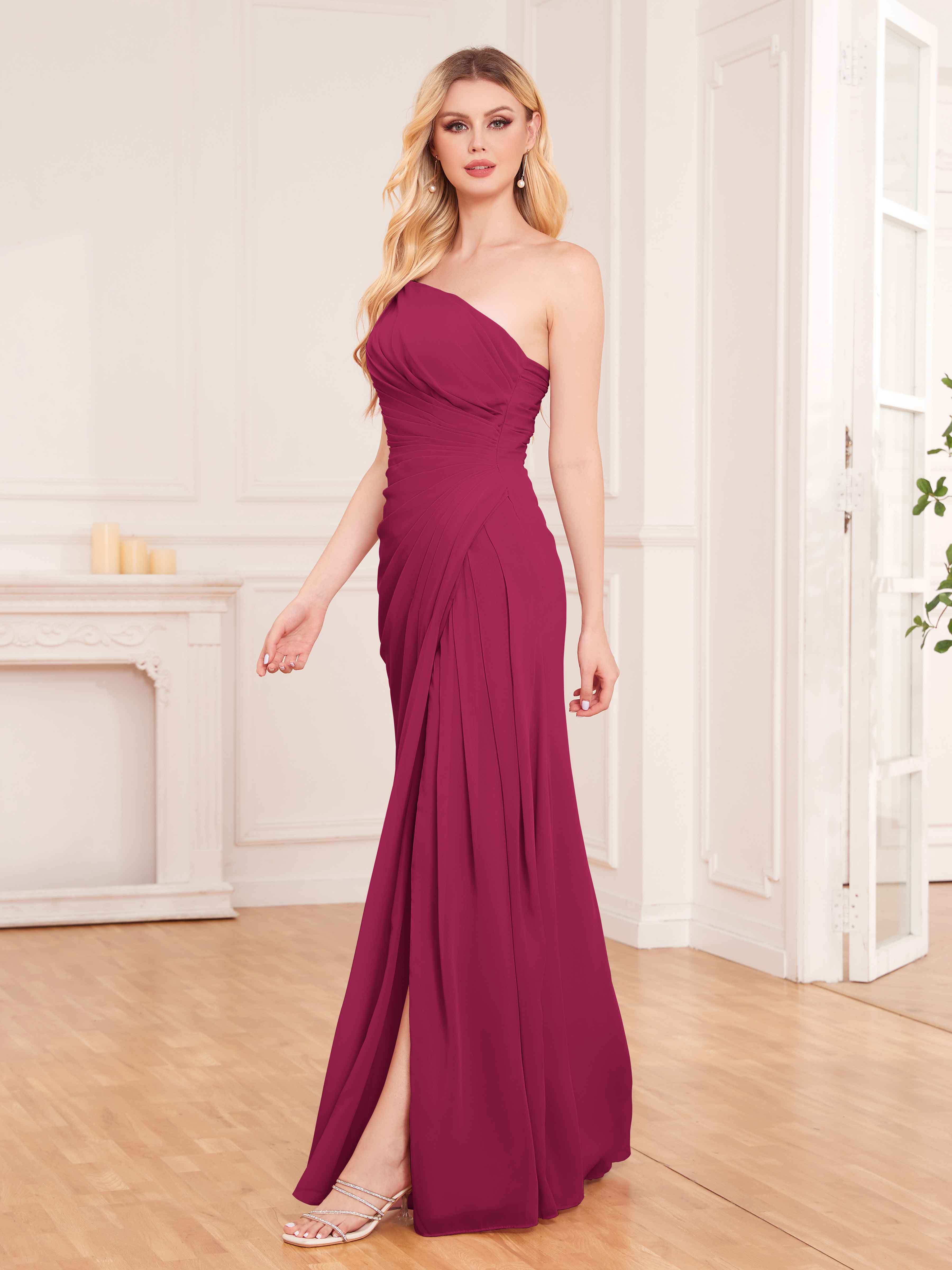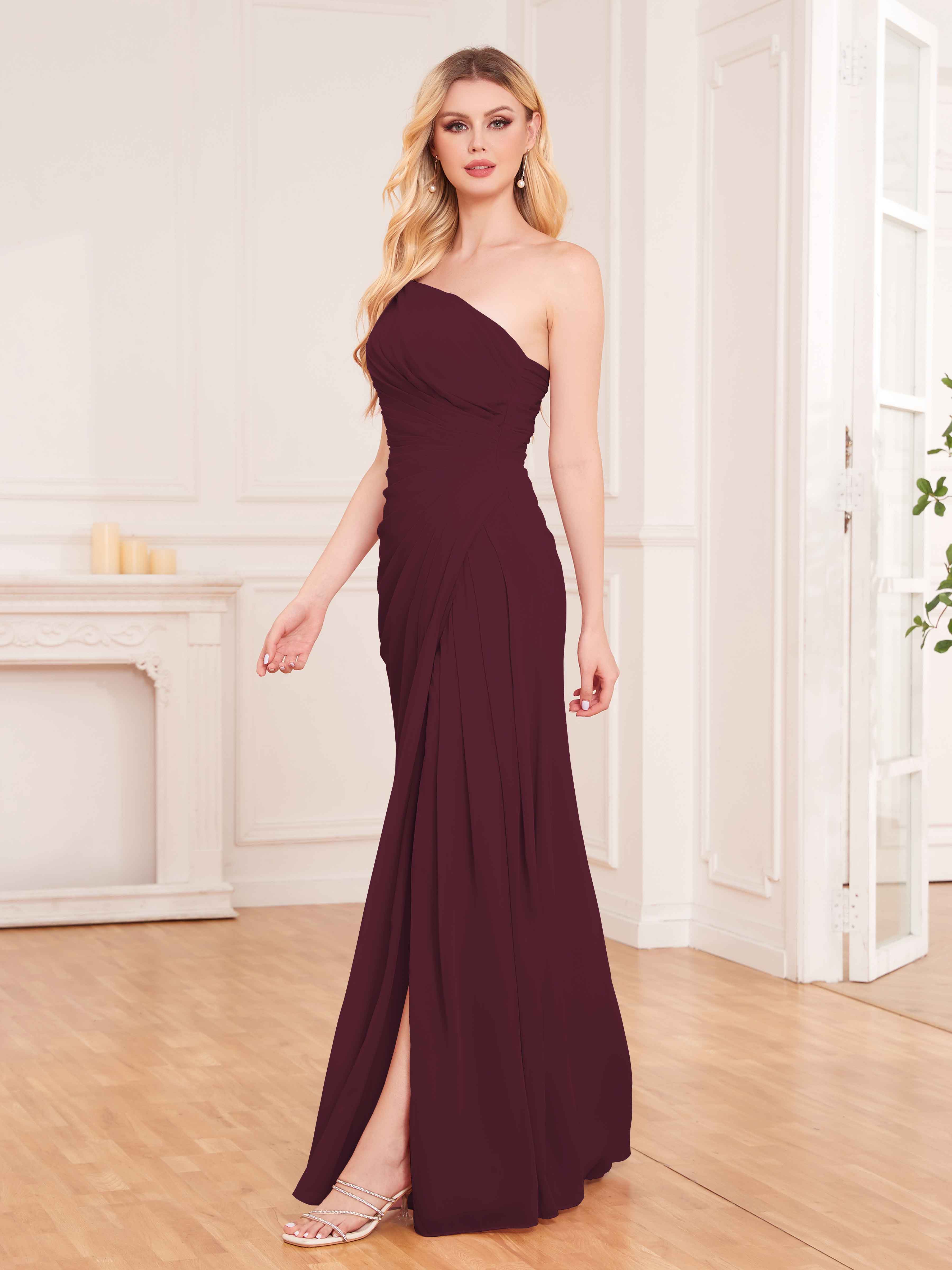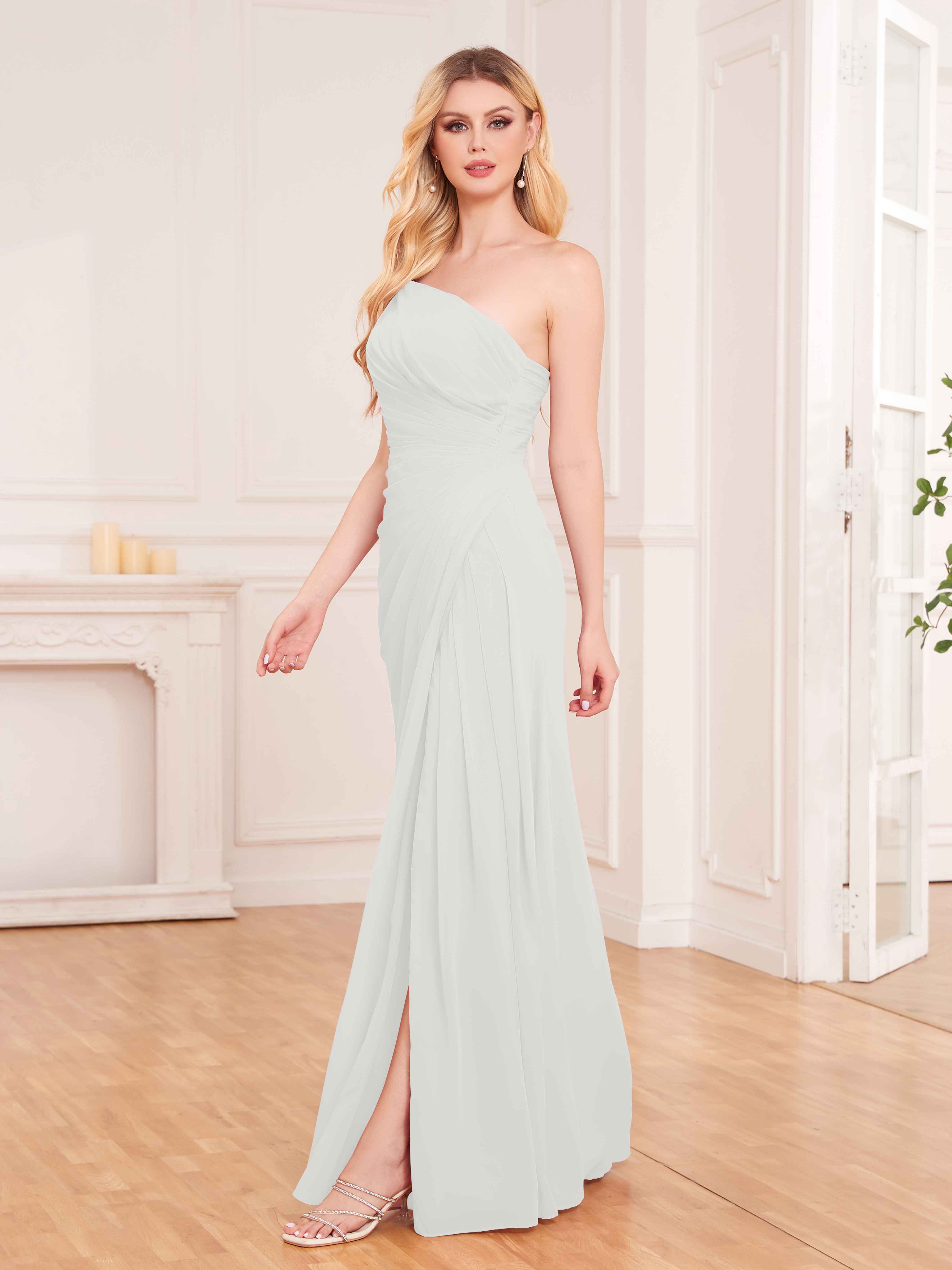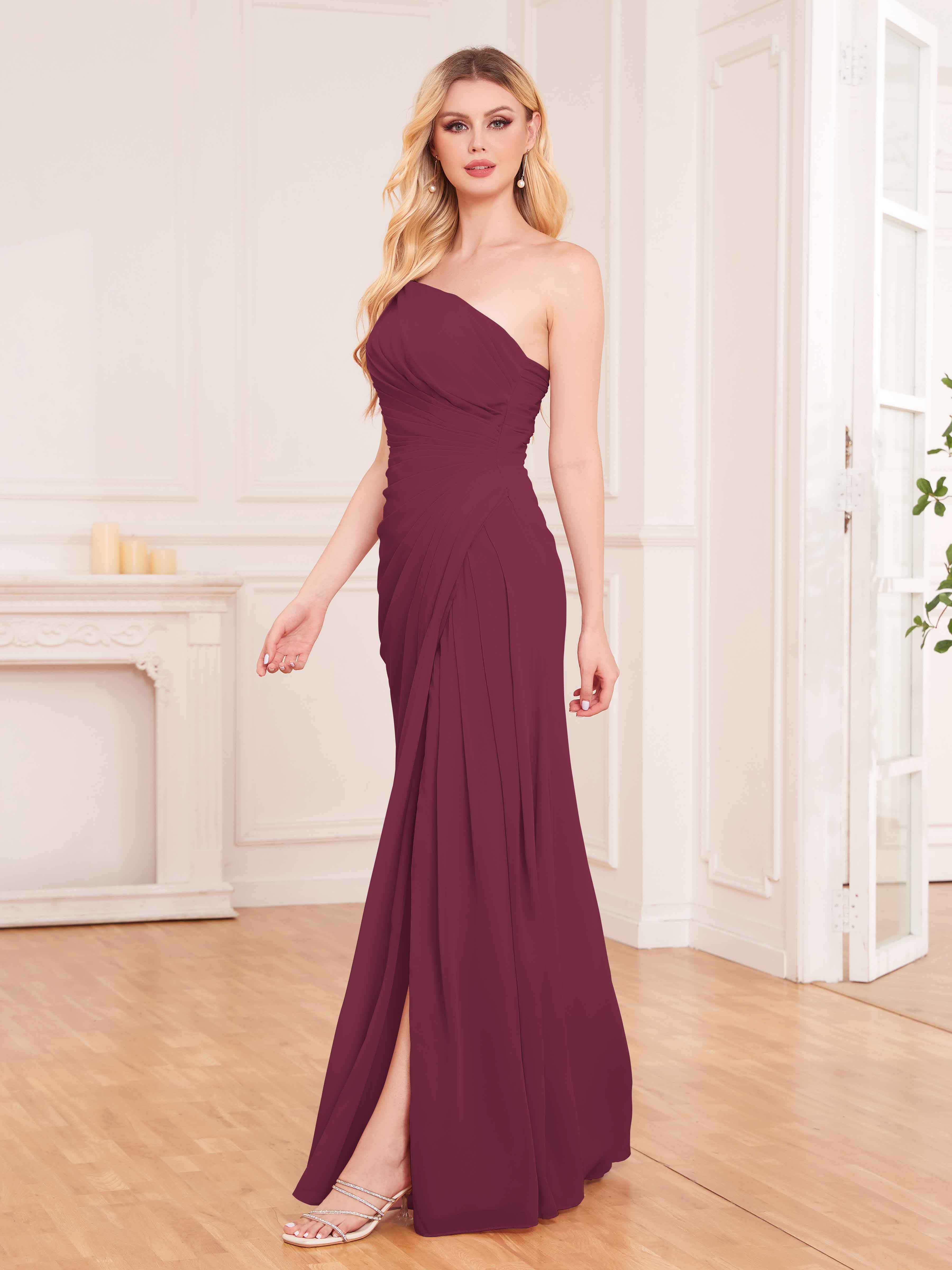 Amara Simple One Shoulder Ruched Slit Long Chiffon Bridesmaid Dresses