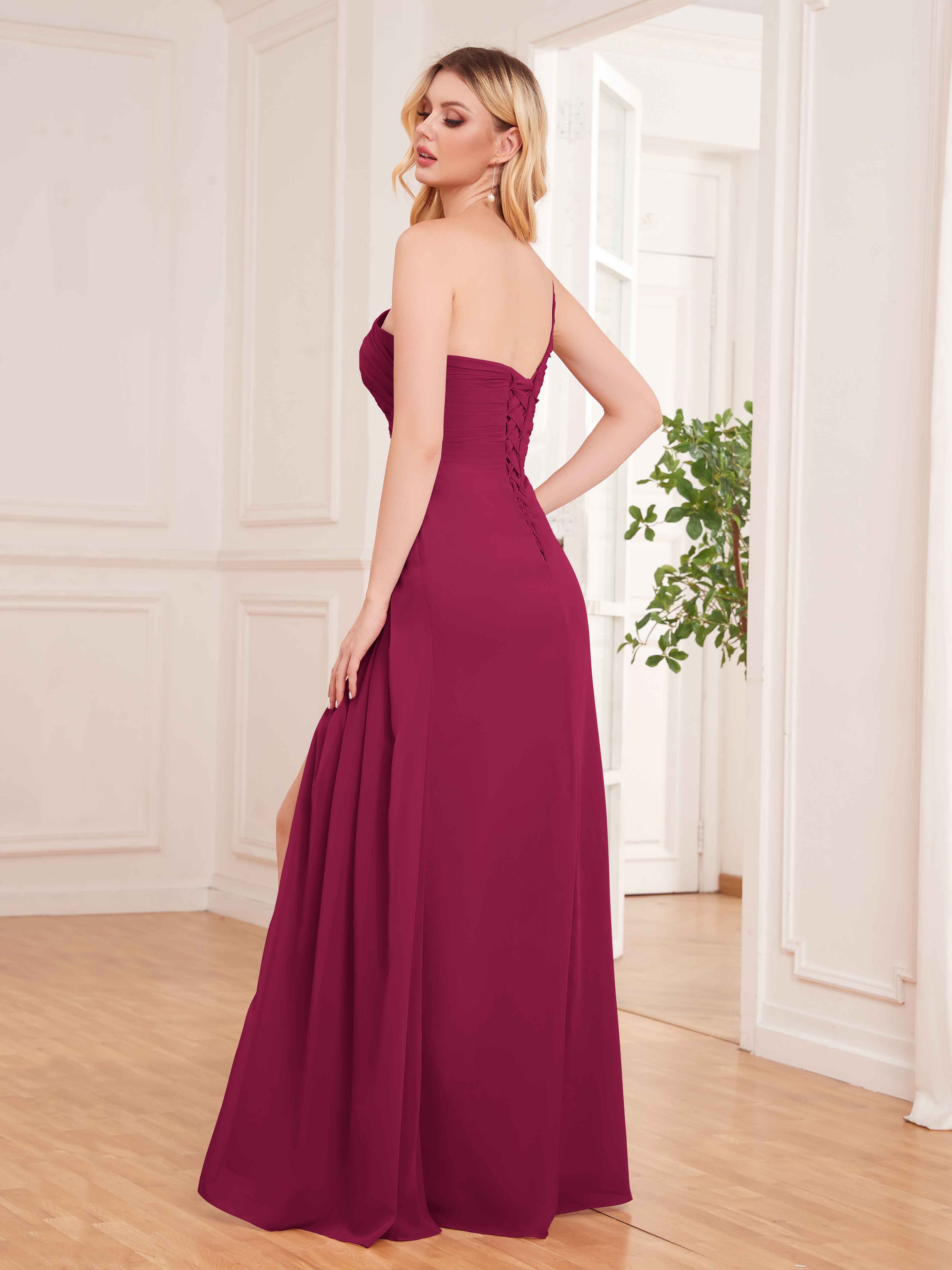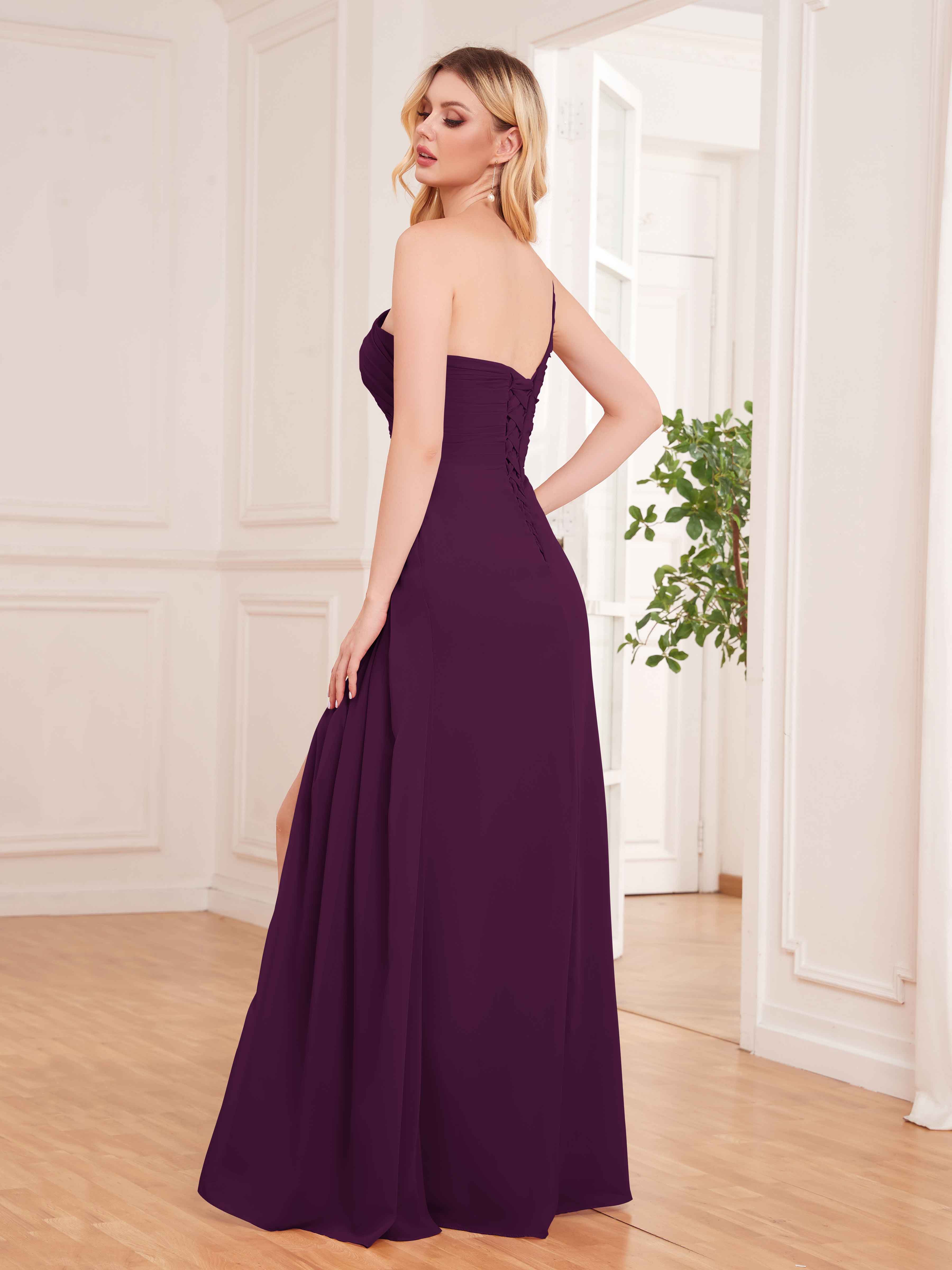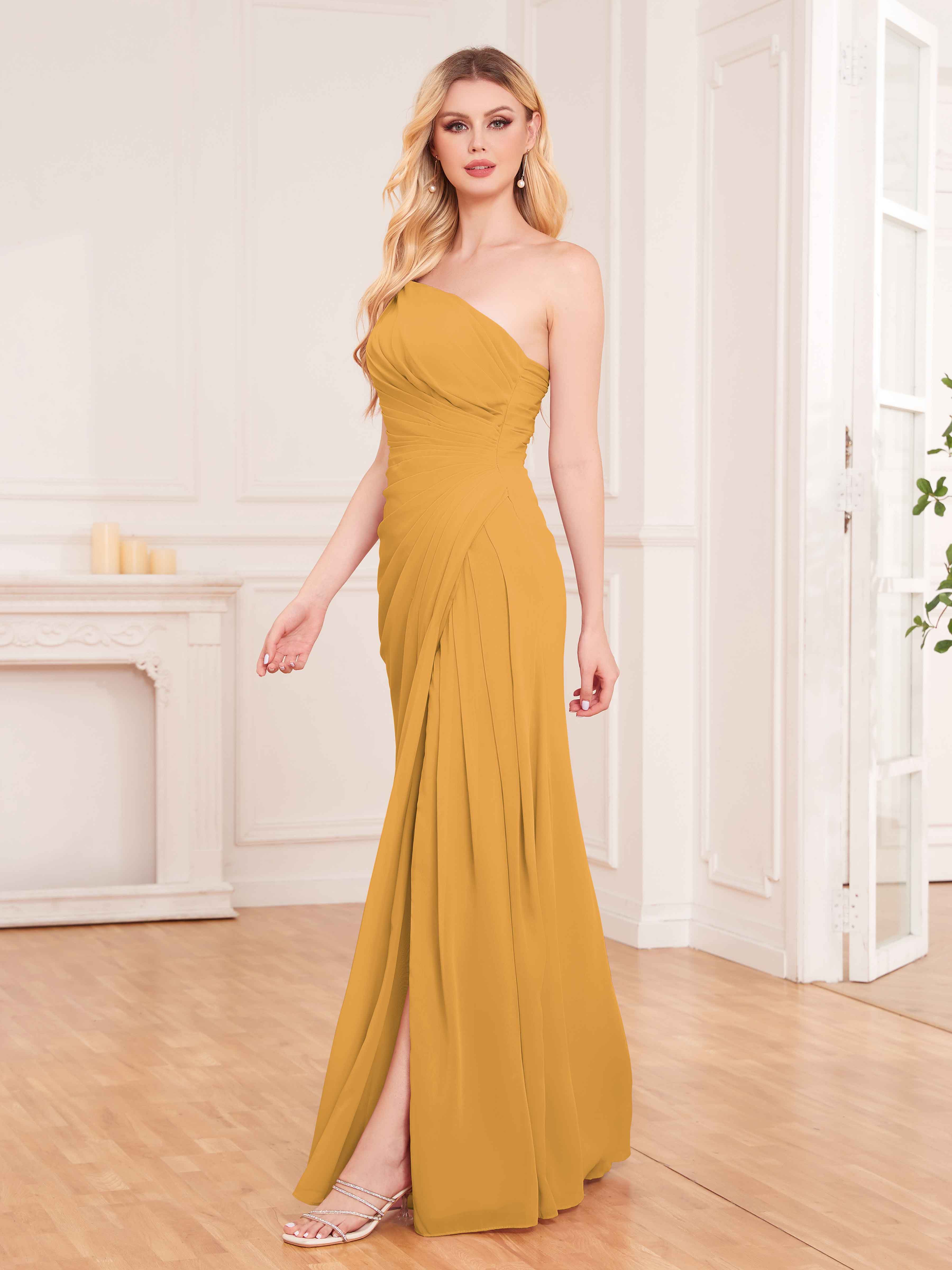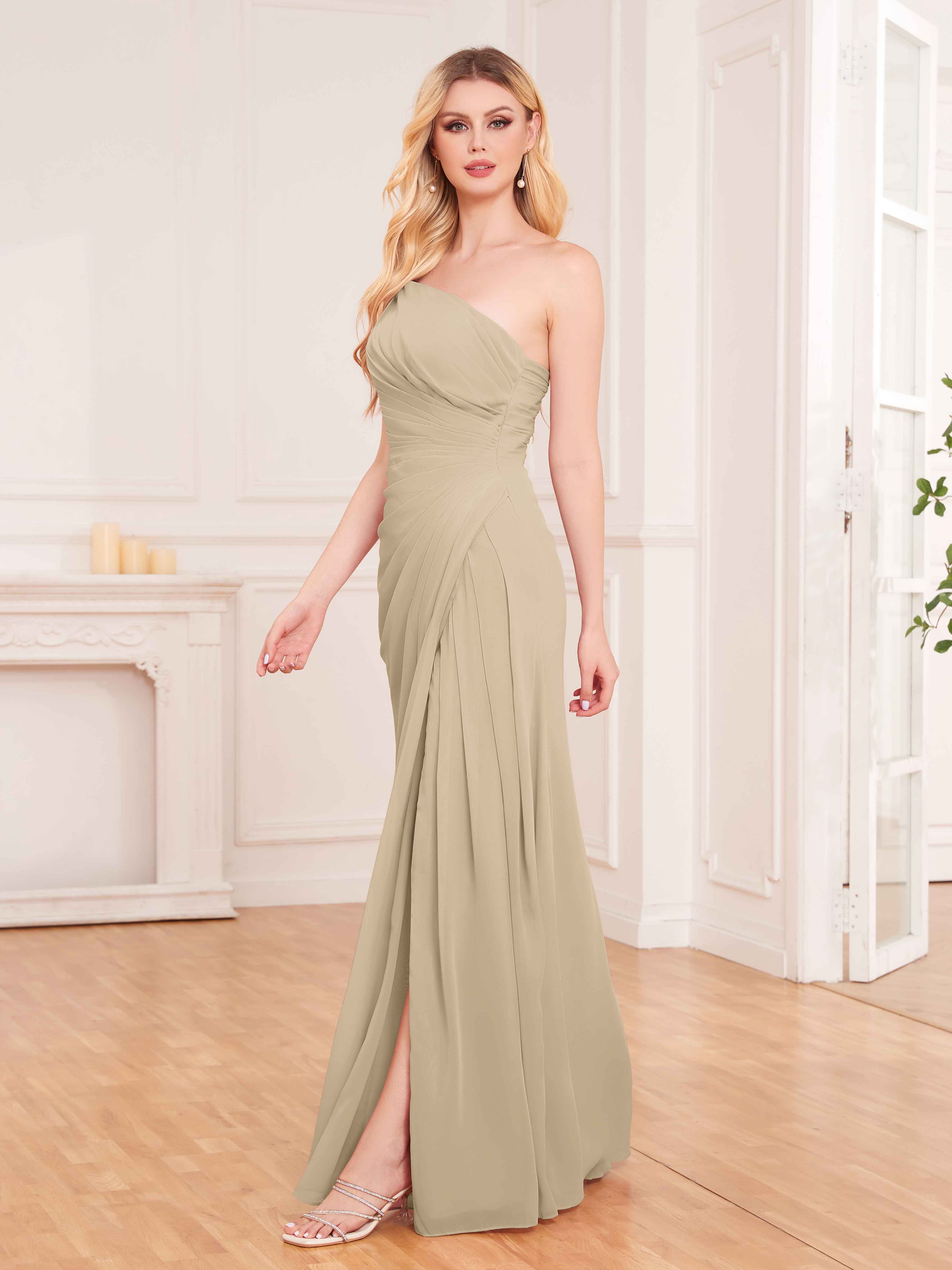 Amara Simple One Shoulder Ruched Slit Long Chiffon Bridesmaid Dresses