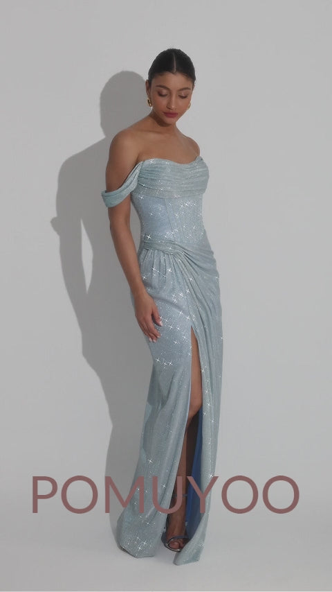 Brynara Gorgeous Off the Shoulder Ruched Corset Slit Long Glitter Prom Dresses