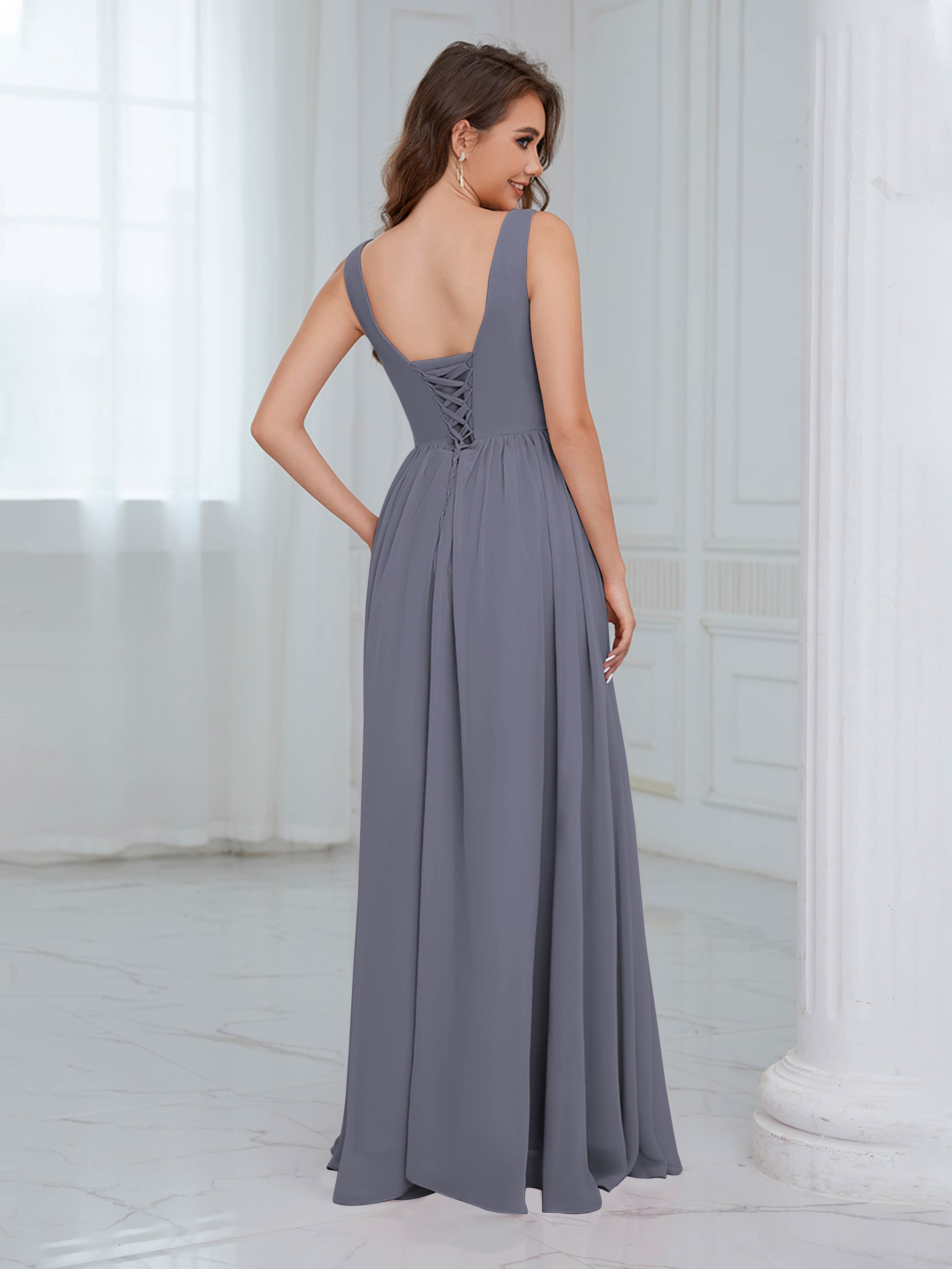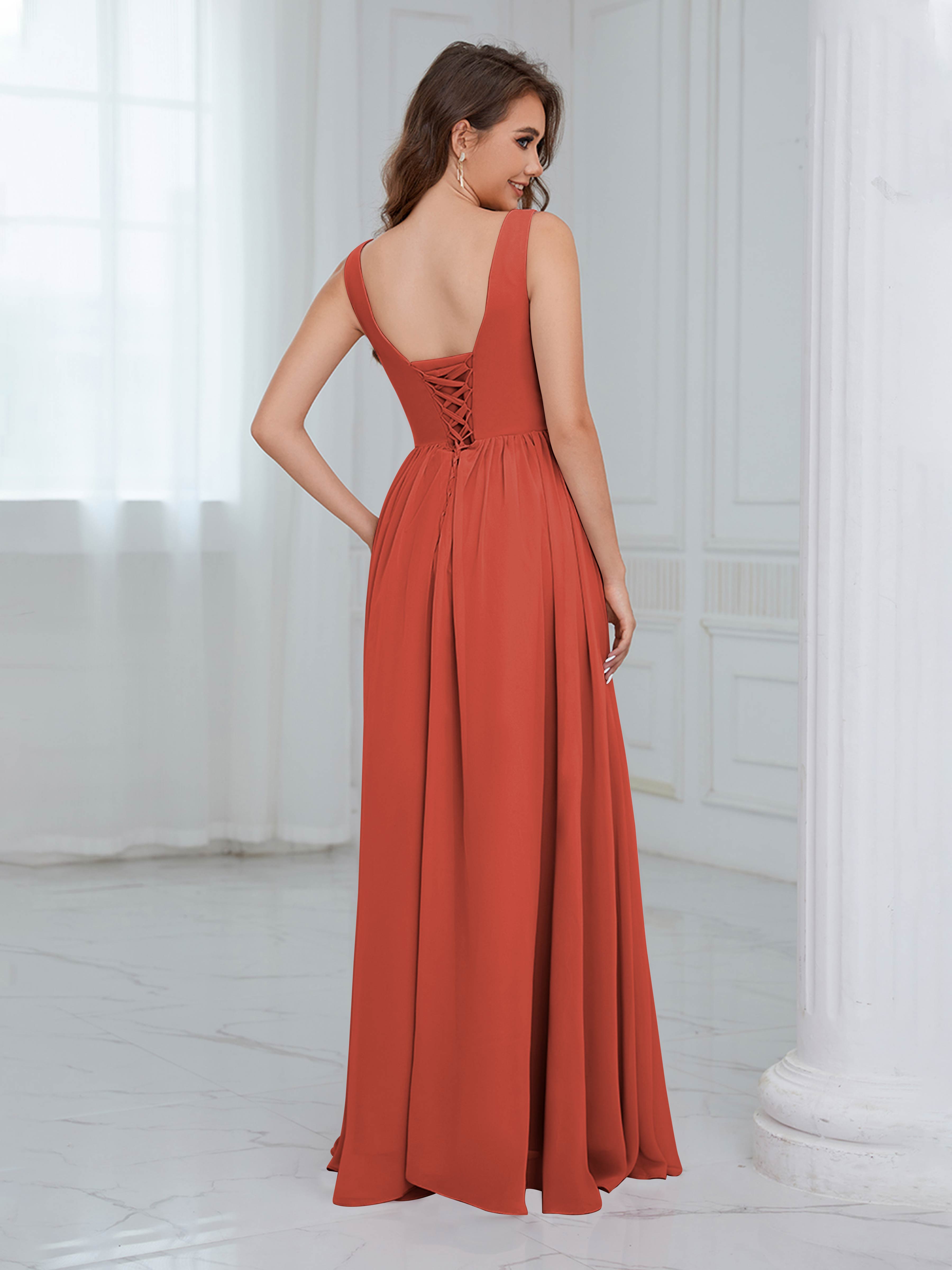 These chic and elegant Bridesmaid Dresses boast a scoop neckline, sleeveless design, and ruched detailing, all crafted from luxurious chiffon fabric. Perfect for any wedding, these dresses offer both style and comfort for your bridal party.