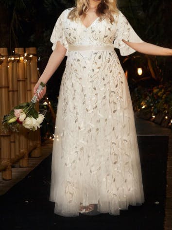 Step into timeless grace with the Fiora Elegant A-Line V Neck Leaf Sequin Long Mother of the Bride Dress. Its flattering A-line silhouette and sophisticated V-neck create a graceful frame, while shimmering leaf sequins add a touch of subtle glamour. Crafted to flow beautifully, this gown offers both comfort and style, making you shine with confidence and poise on your loved one’s special day. The perfect blend of elegance and sparkle for a memorable celebration.