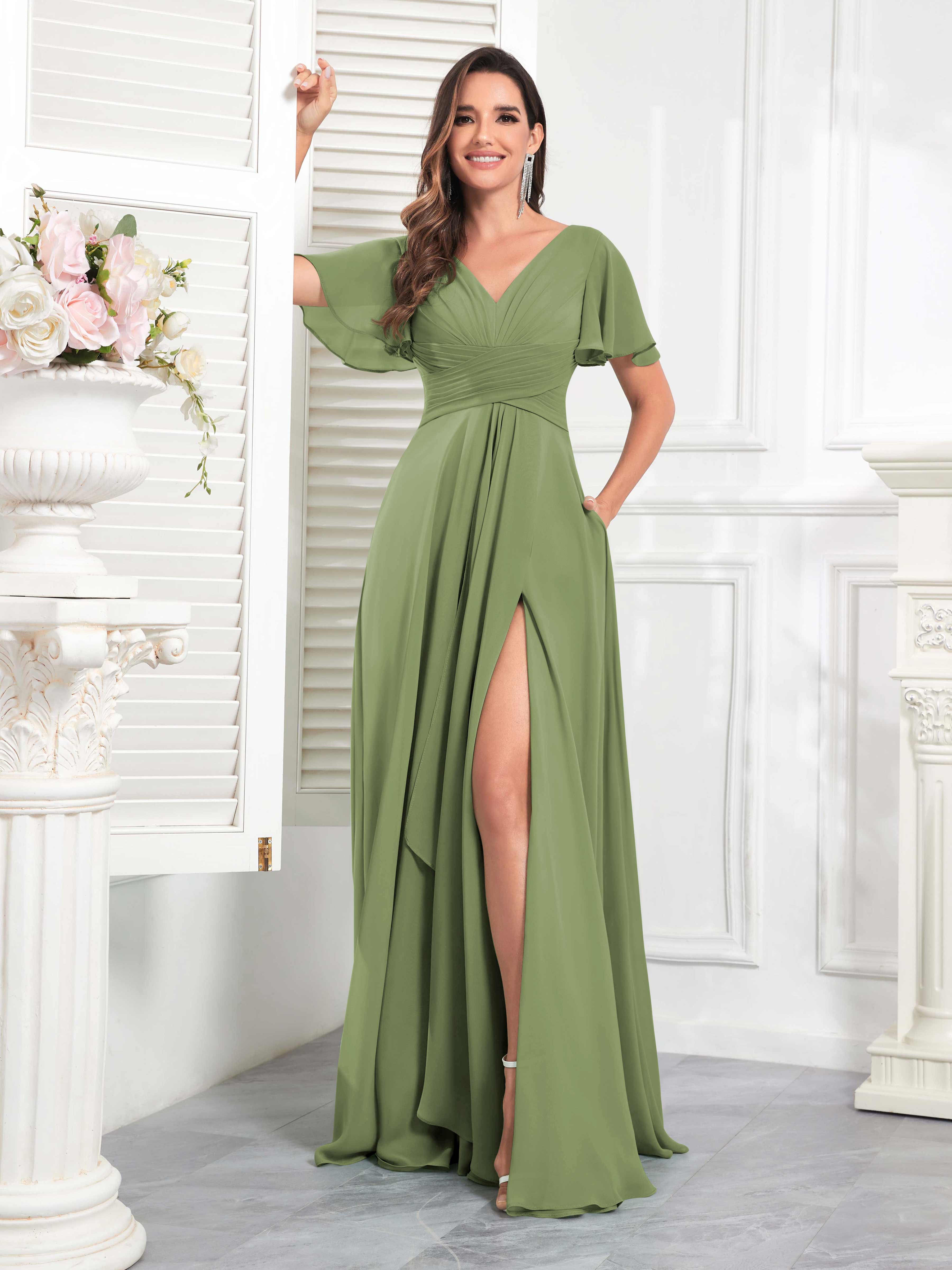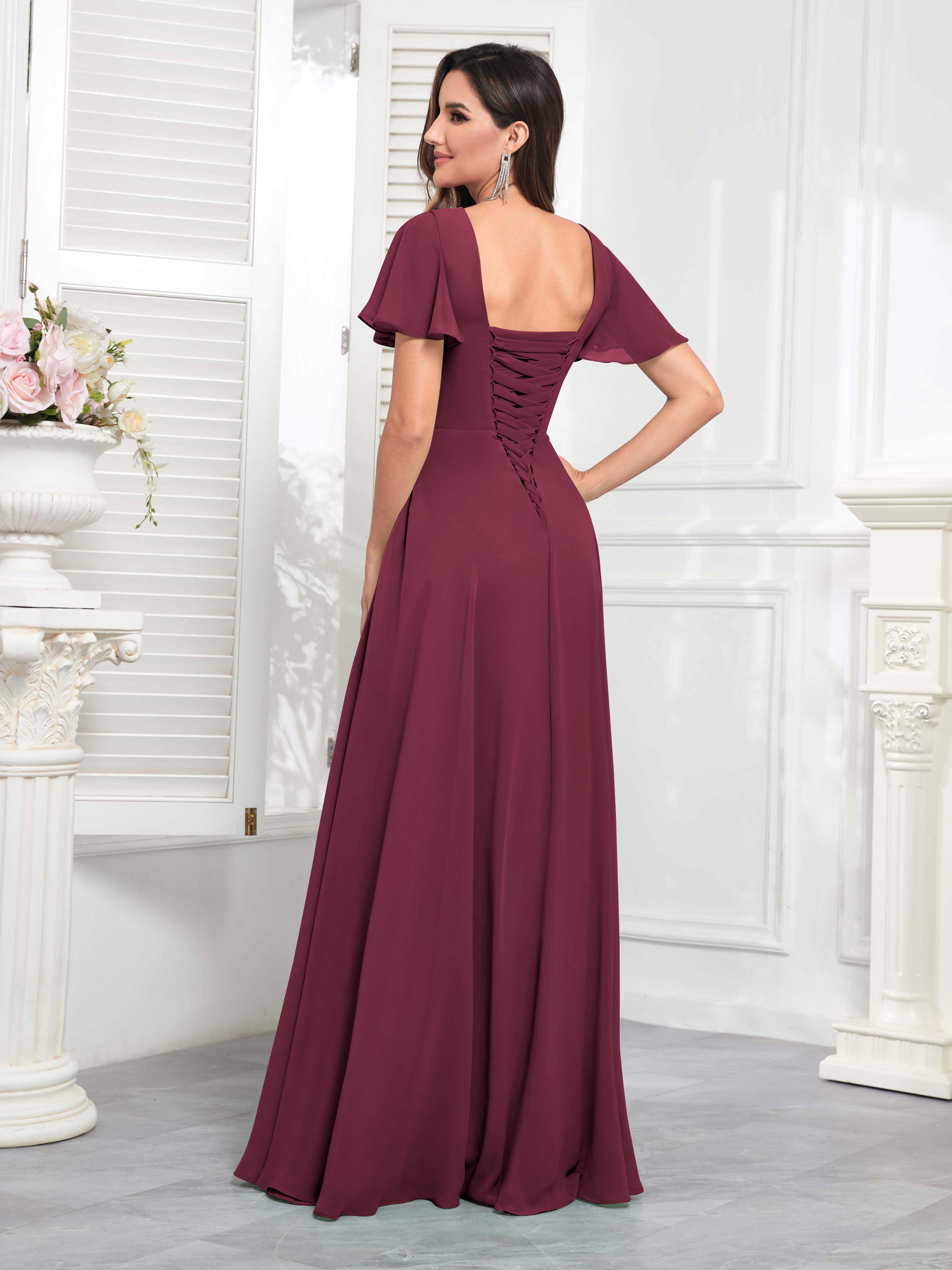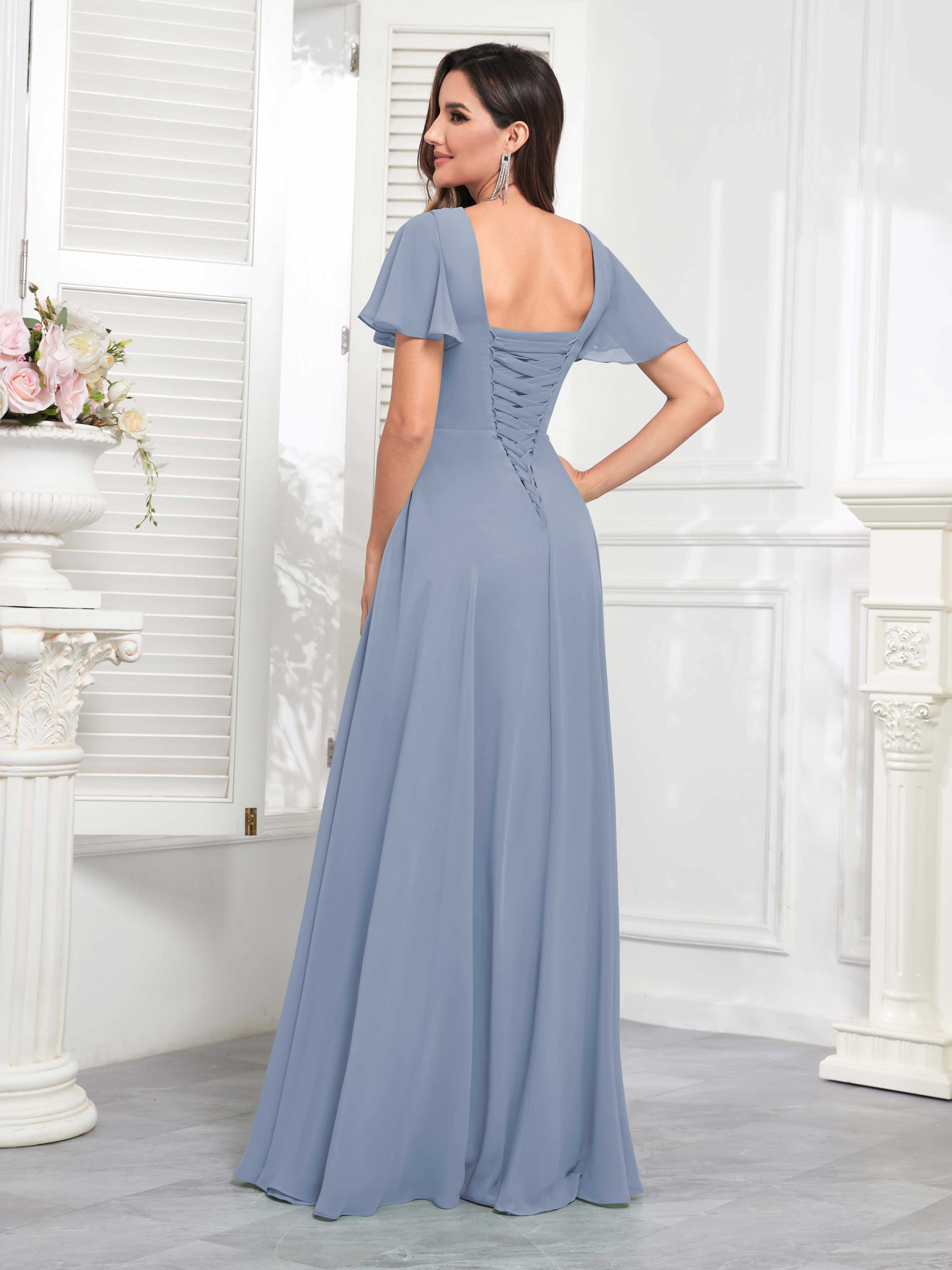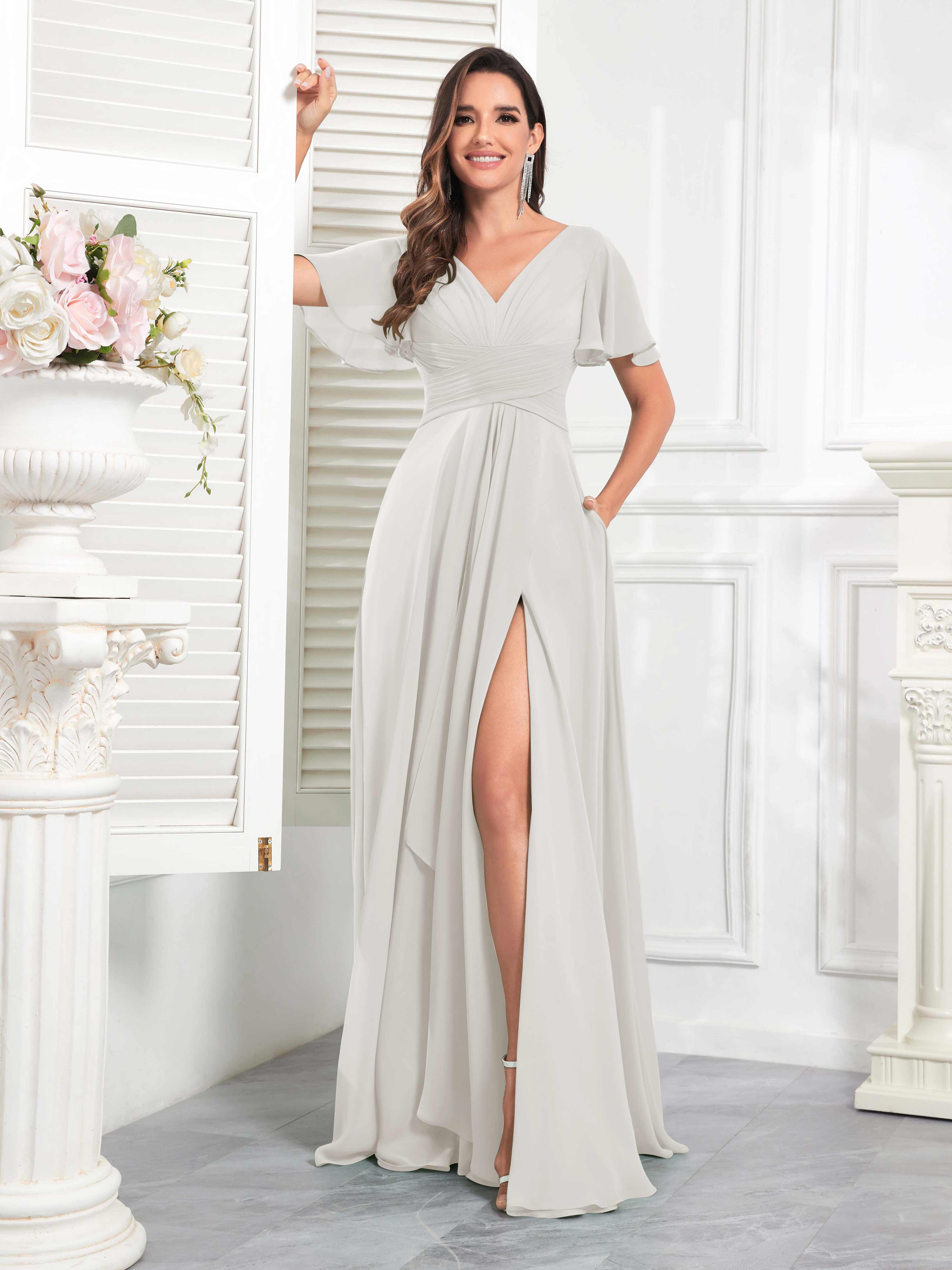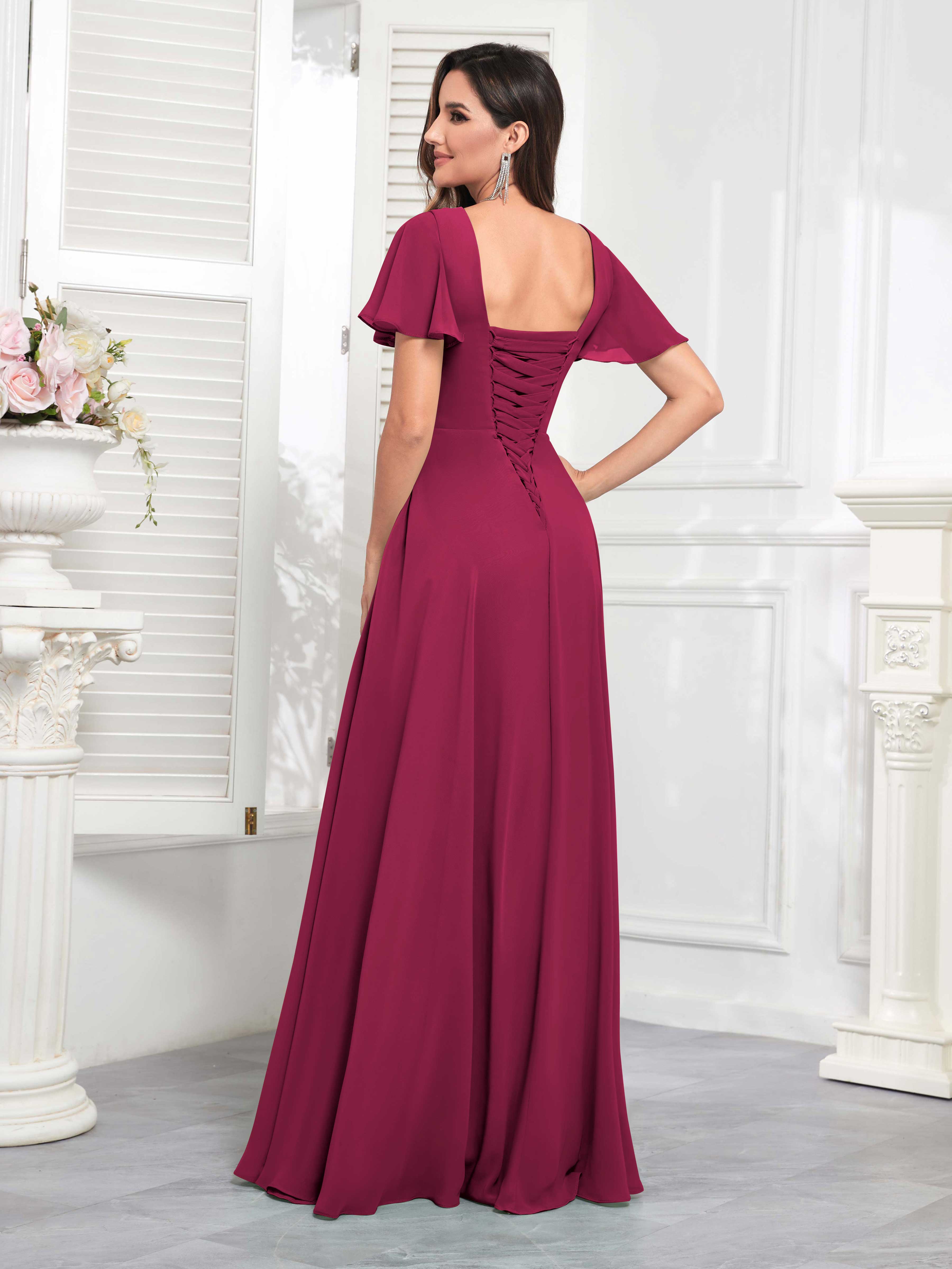 Gracelyn Modest Short Sleeves Ruffles Maxi Chiffon Bridesmaid Dresses