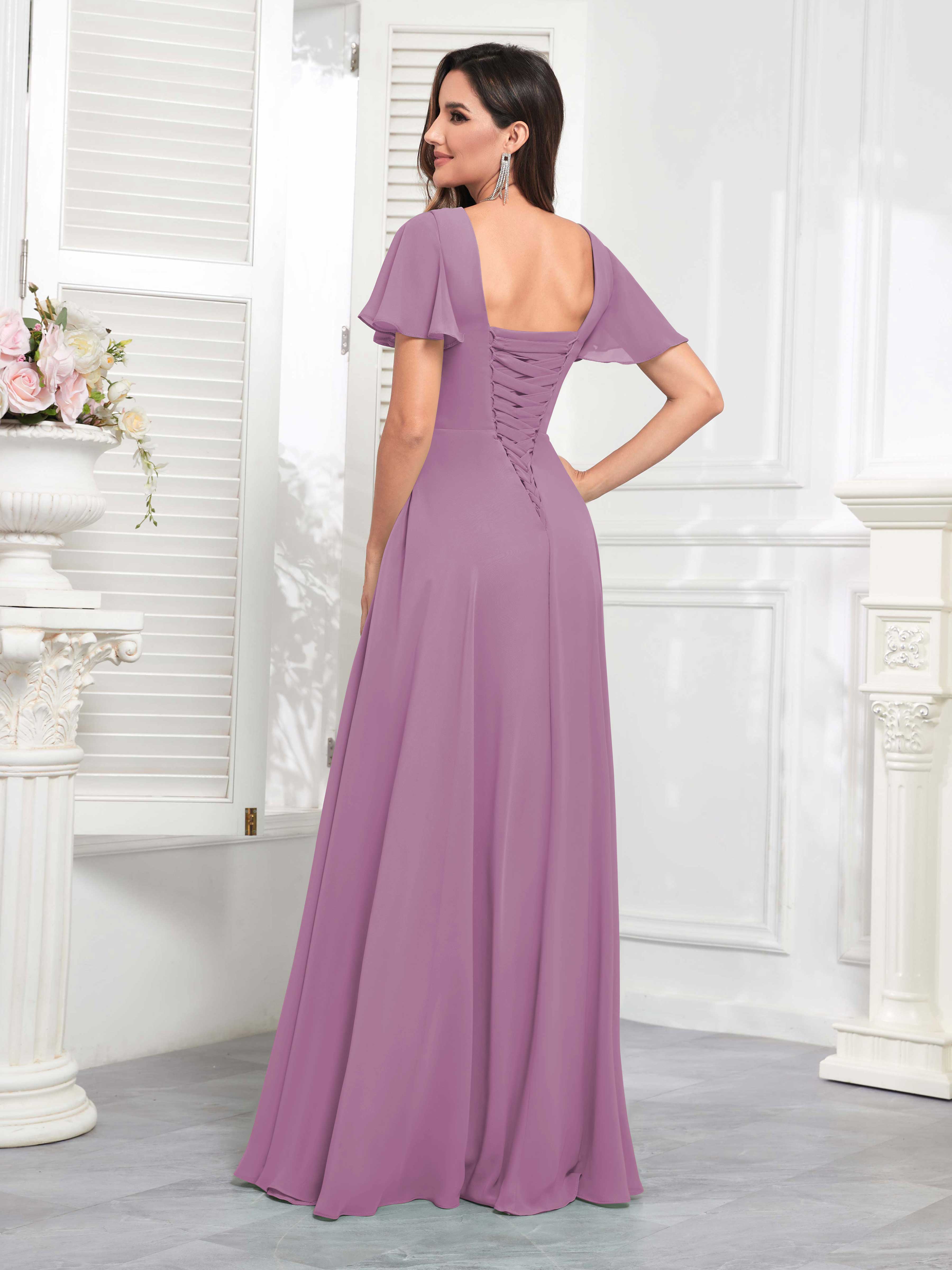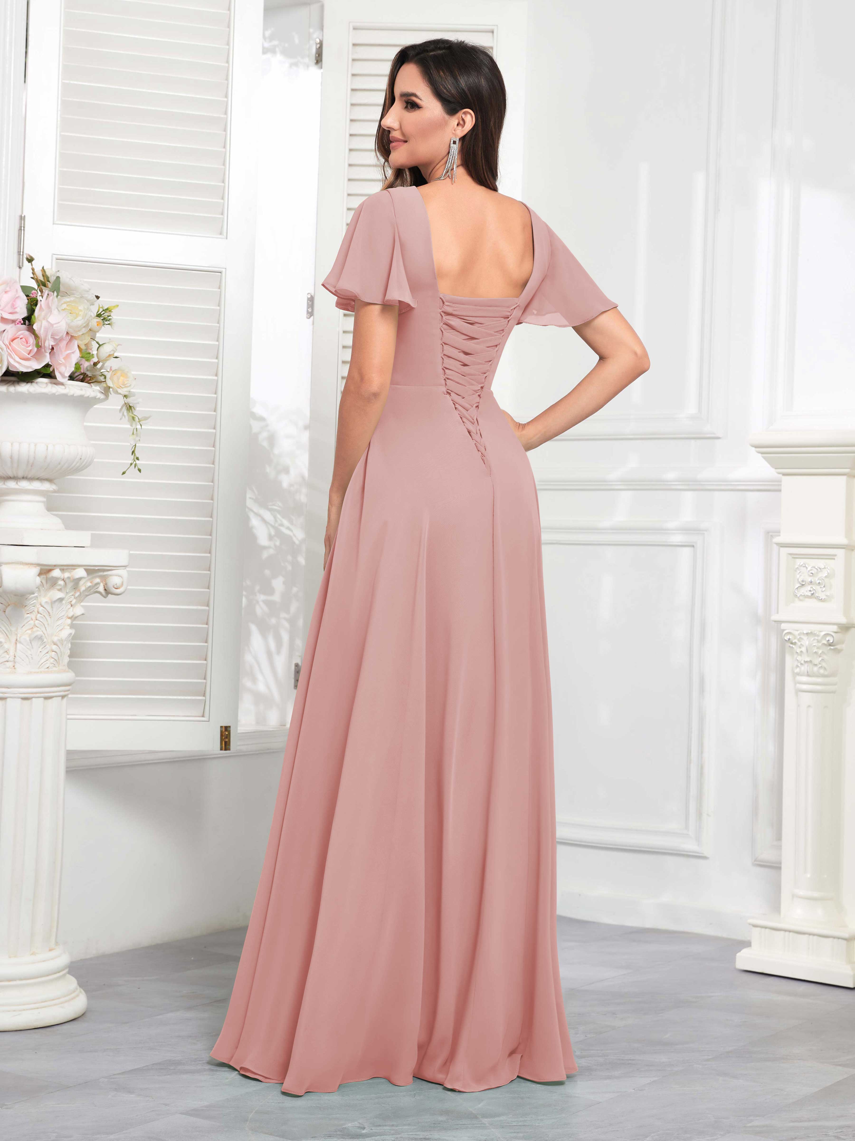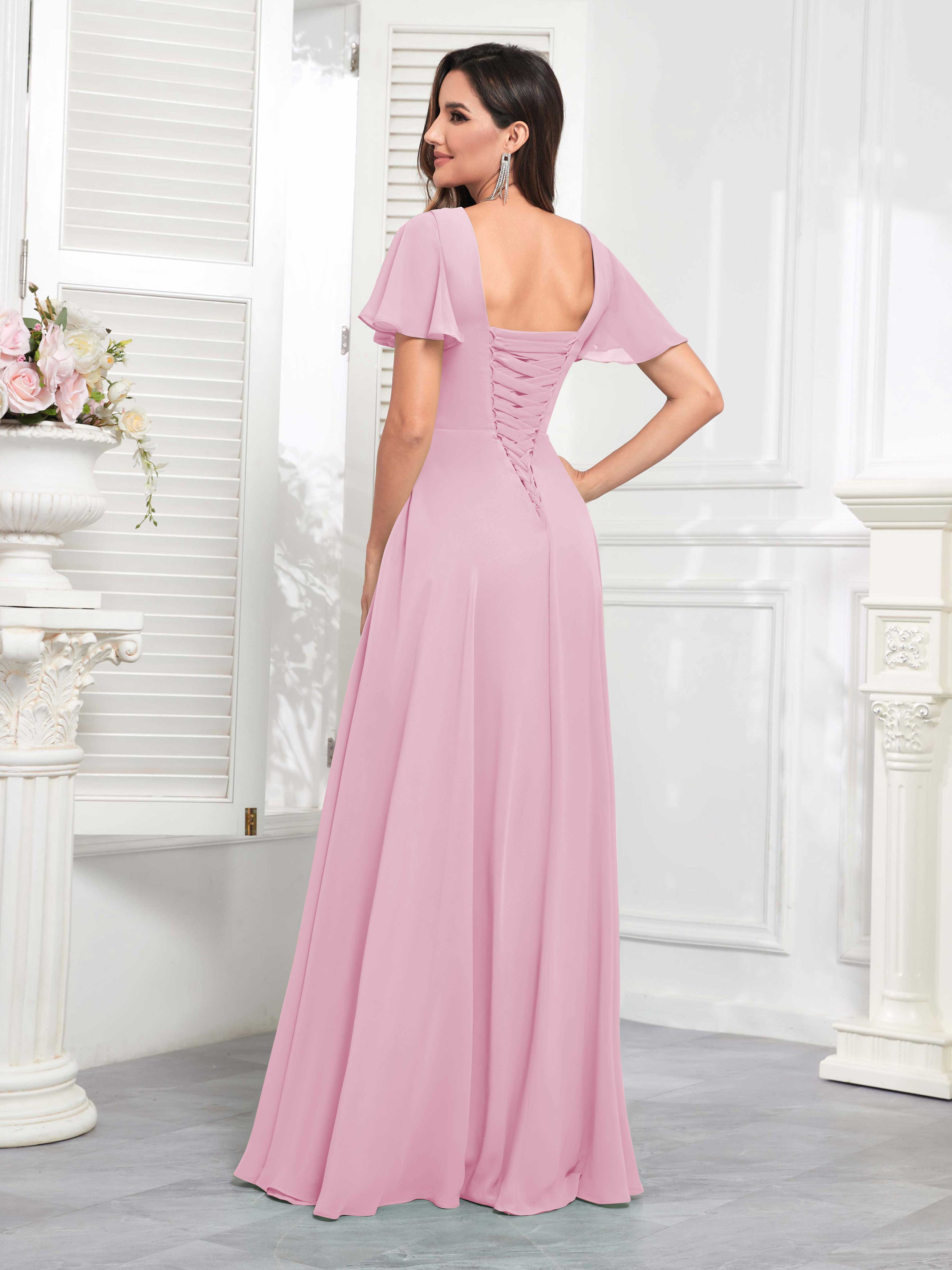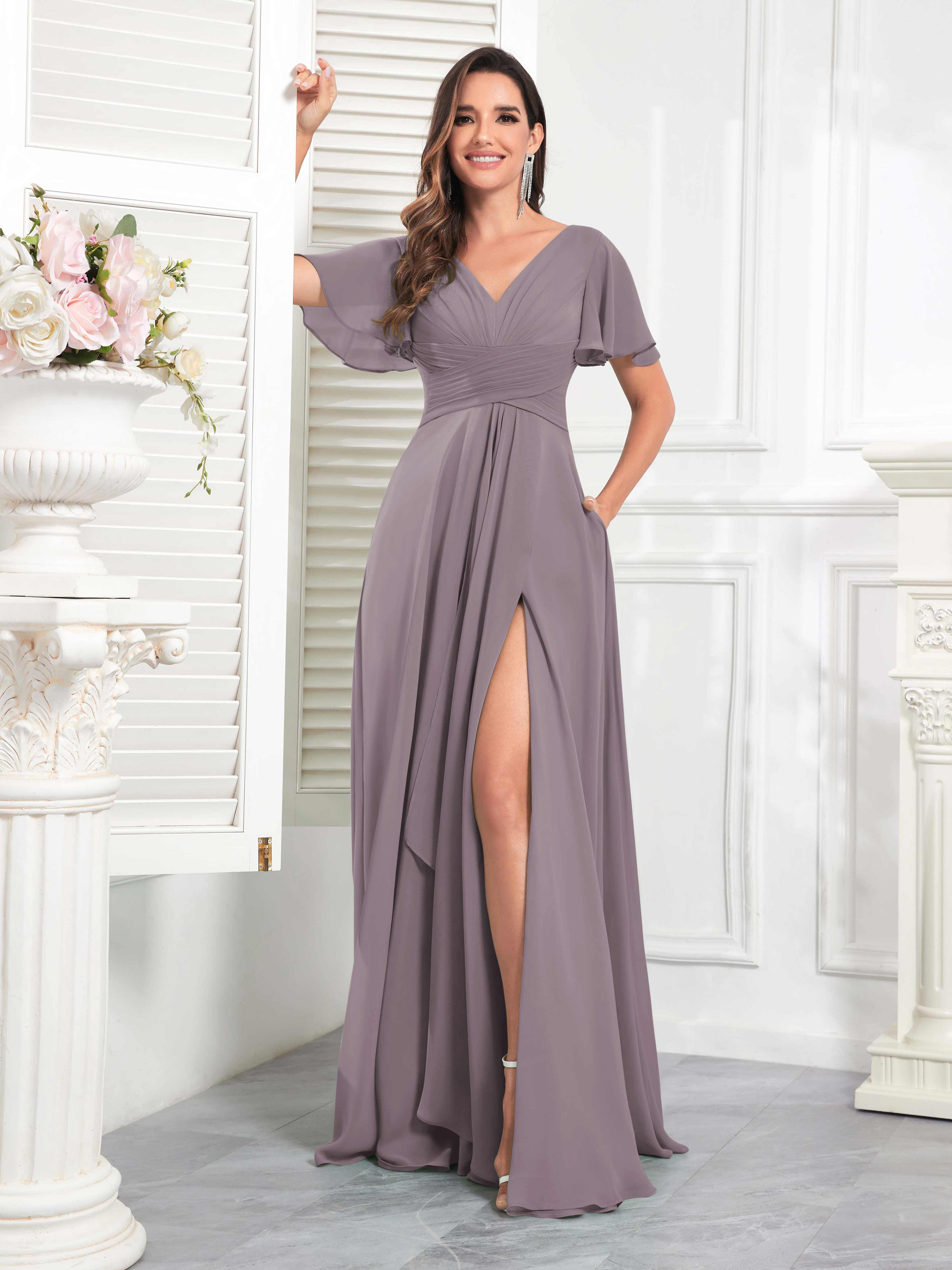 Gracelyn Modest Short Sleeves Ruffles Maxi Chiffon Bridesmaid Dresses