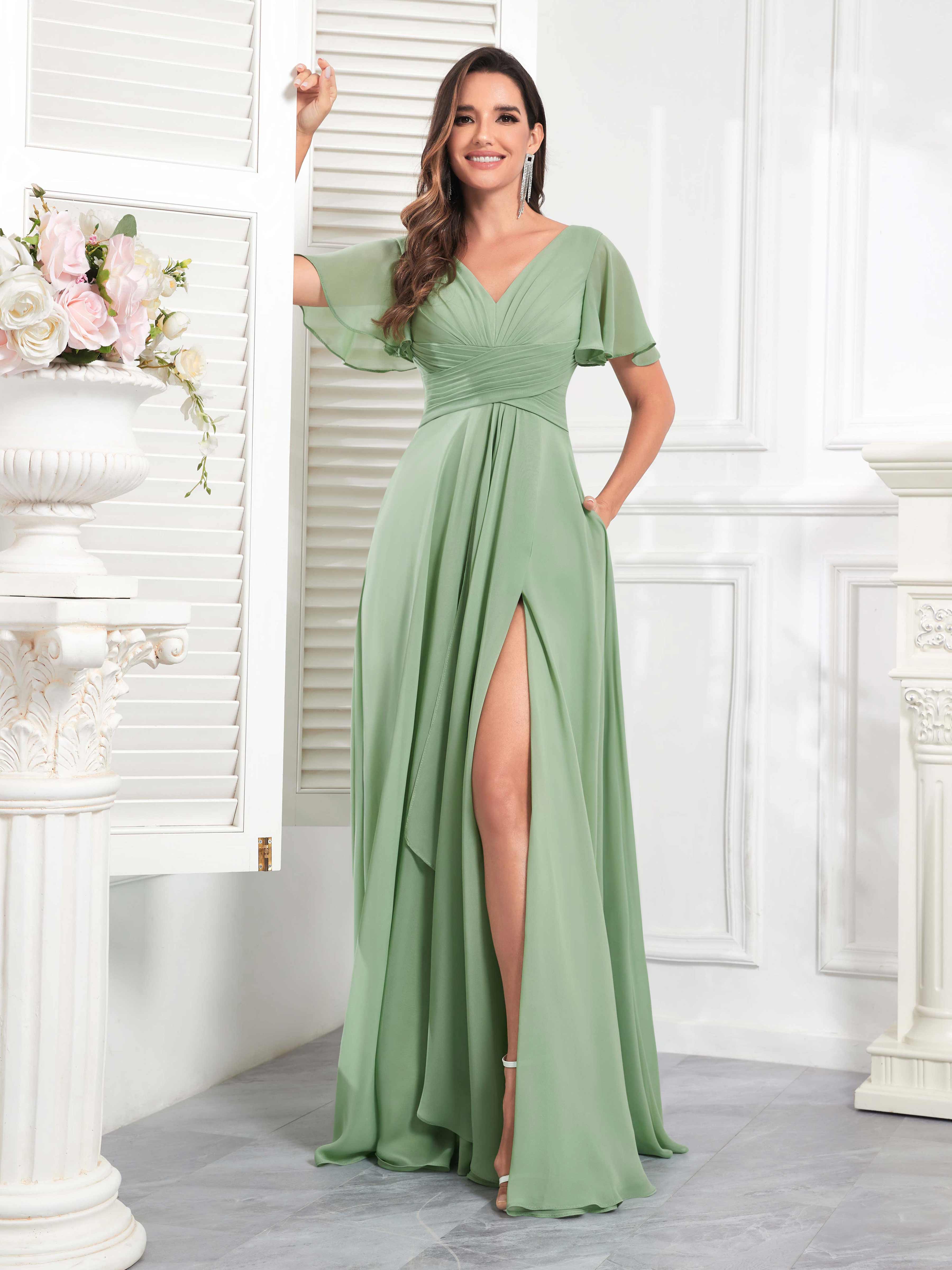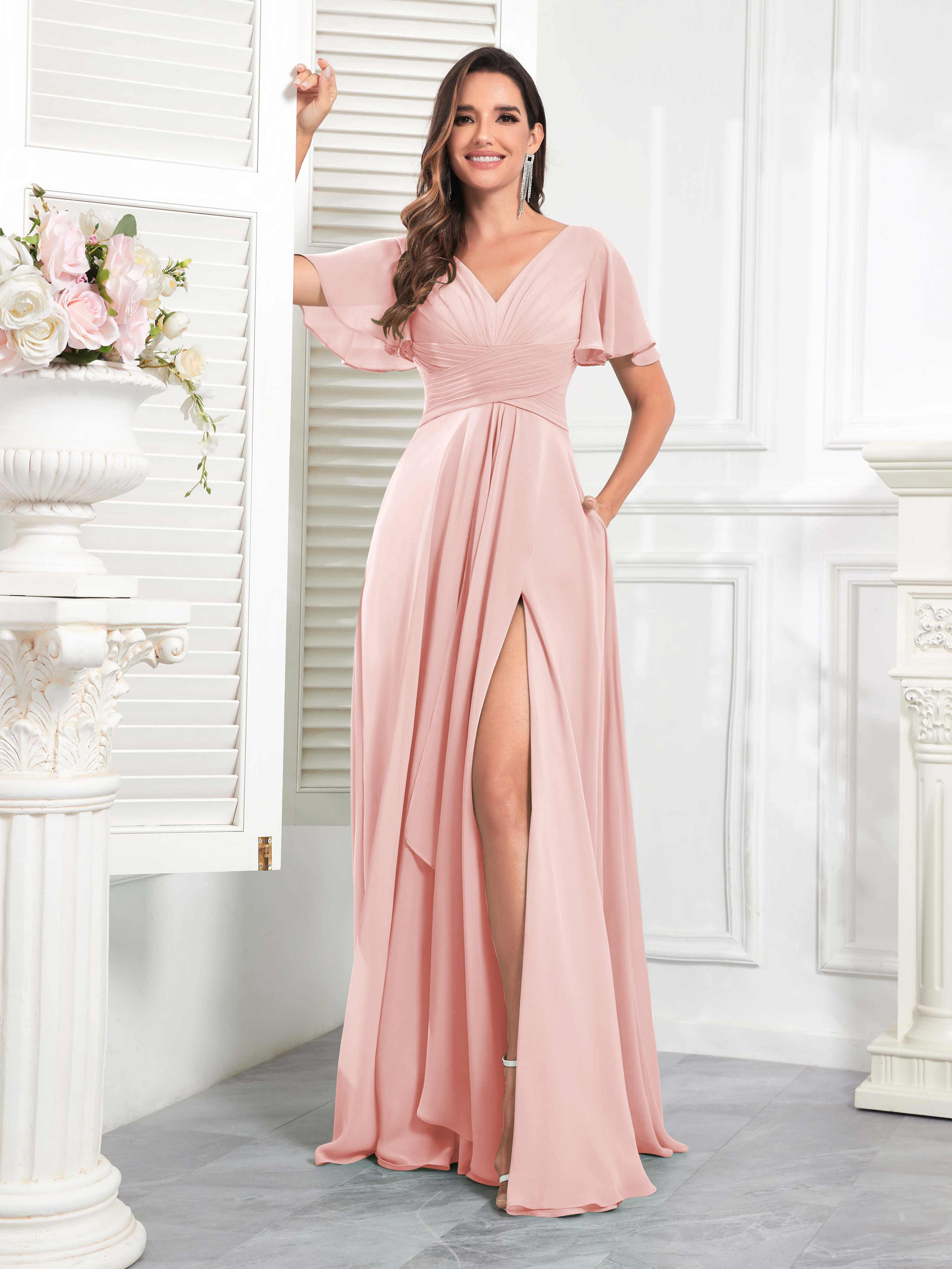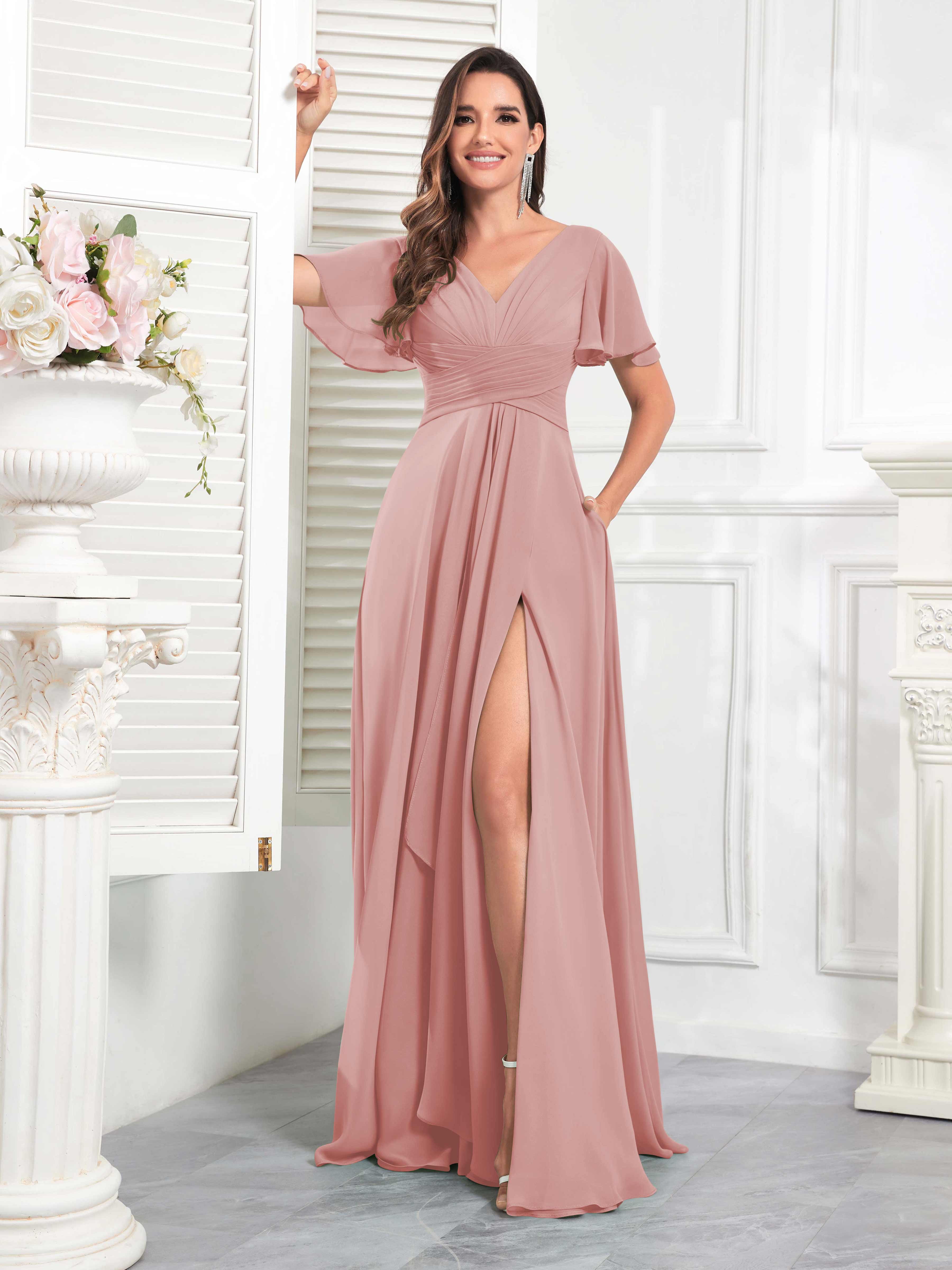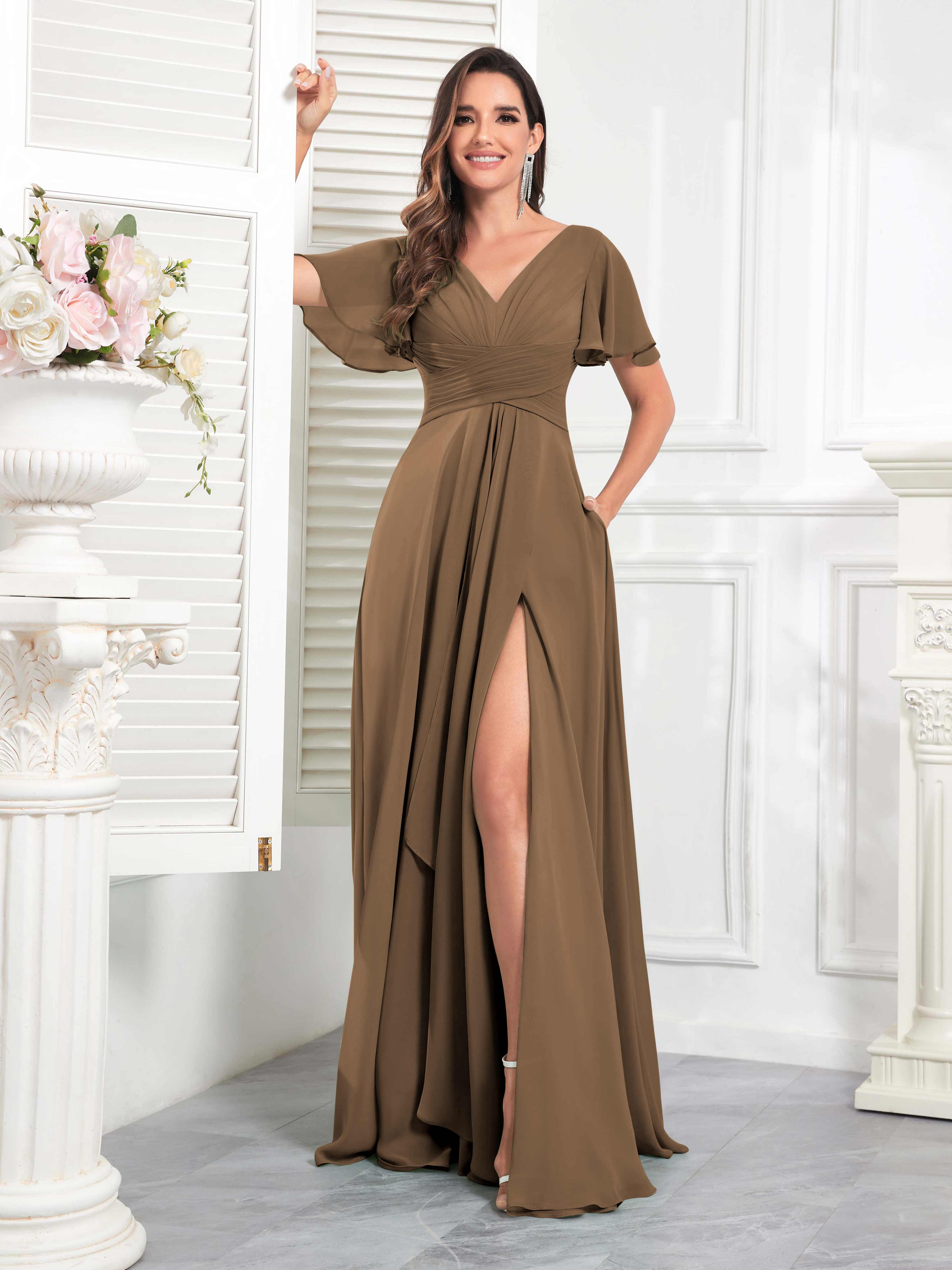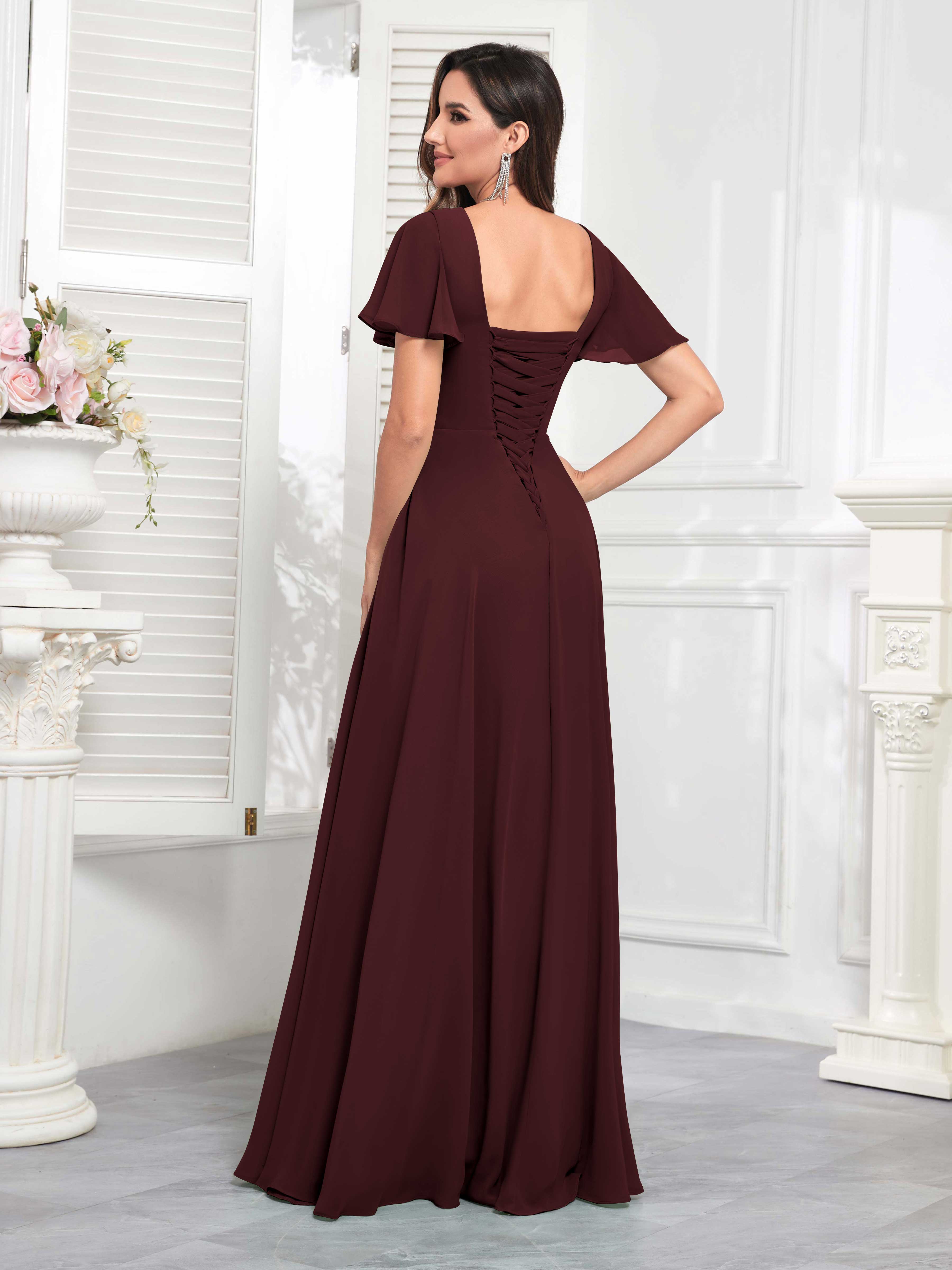 Gracelyn Modest Short Sleeves Ruffles Maxi Chiffon Bridesmaid Dresses