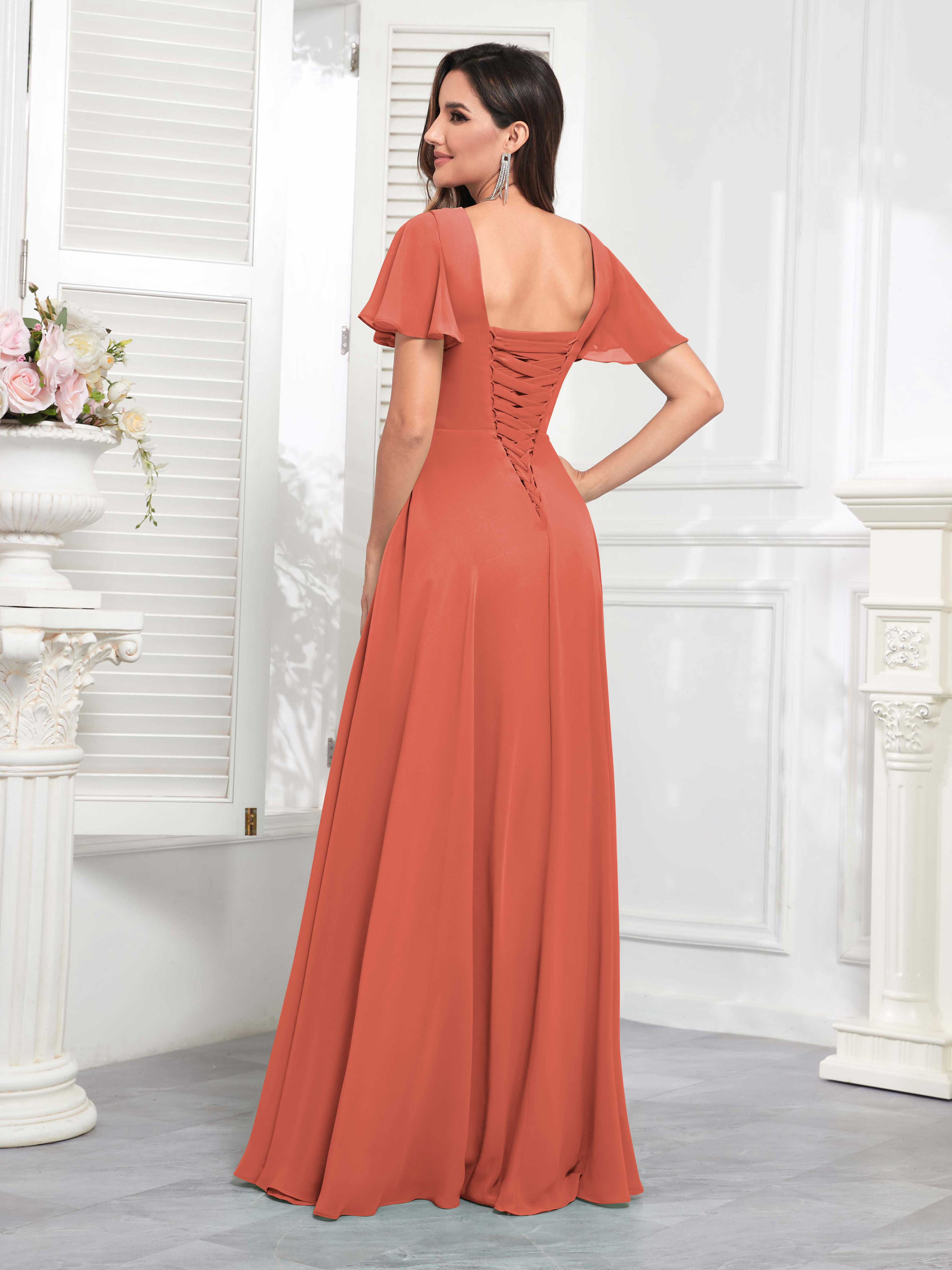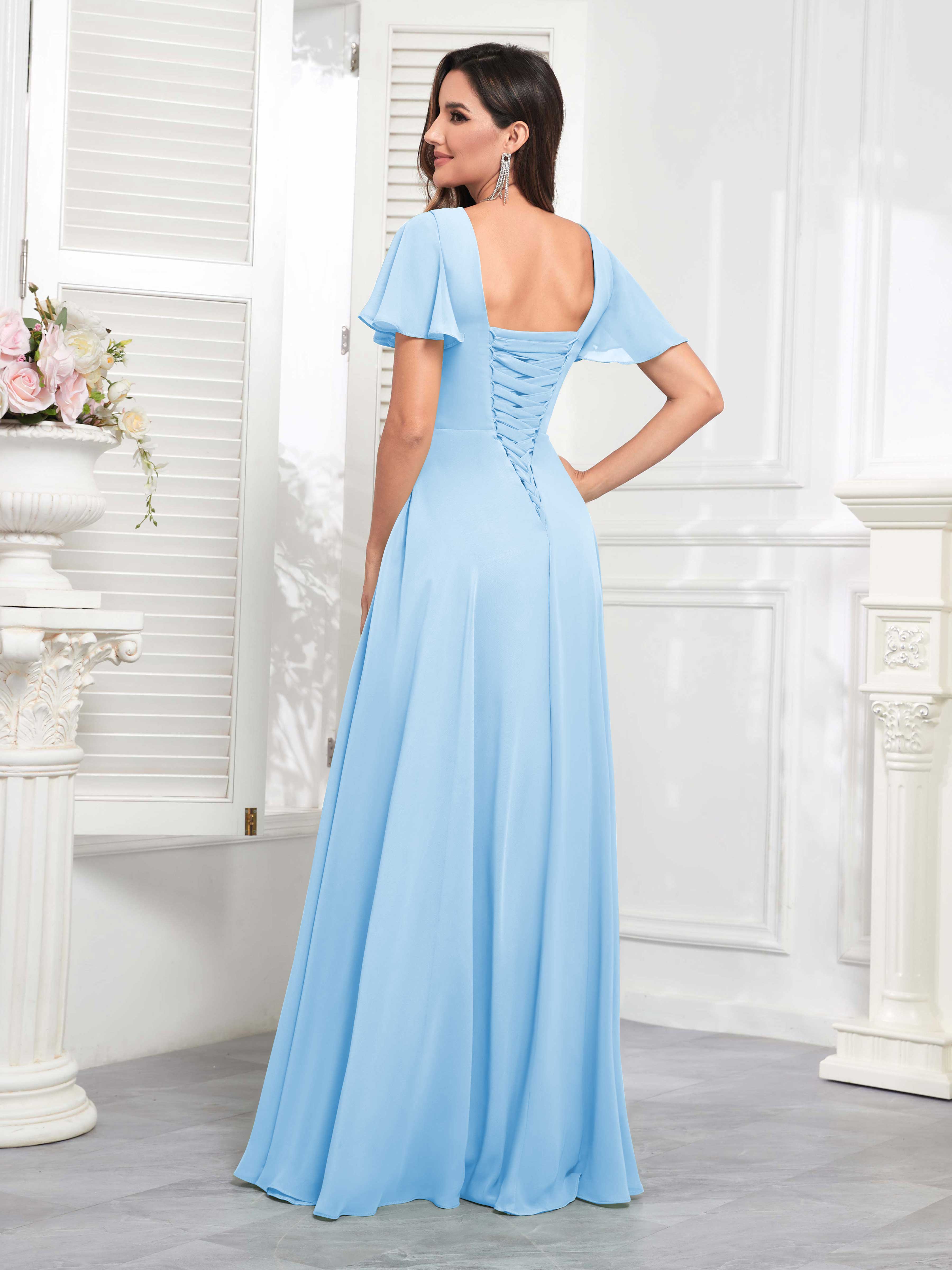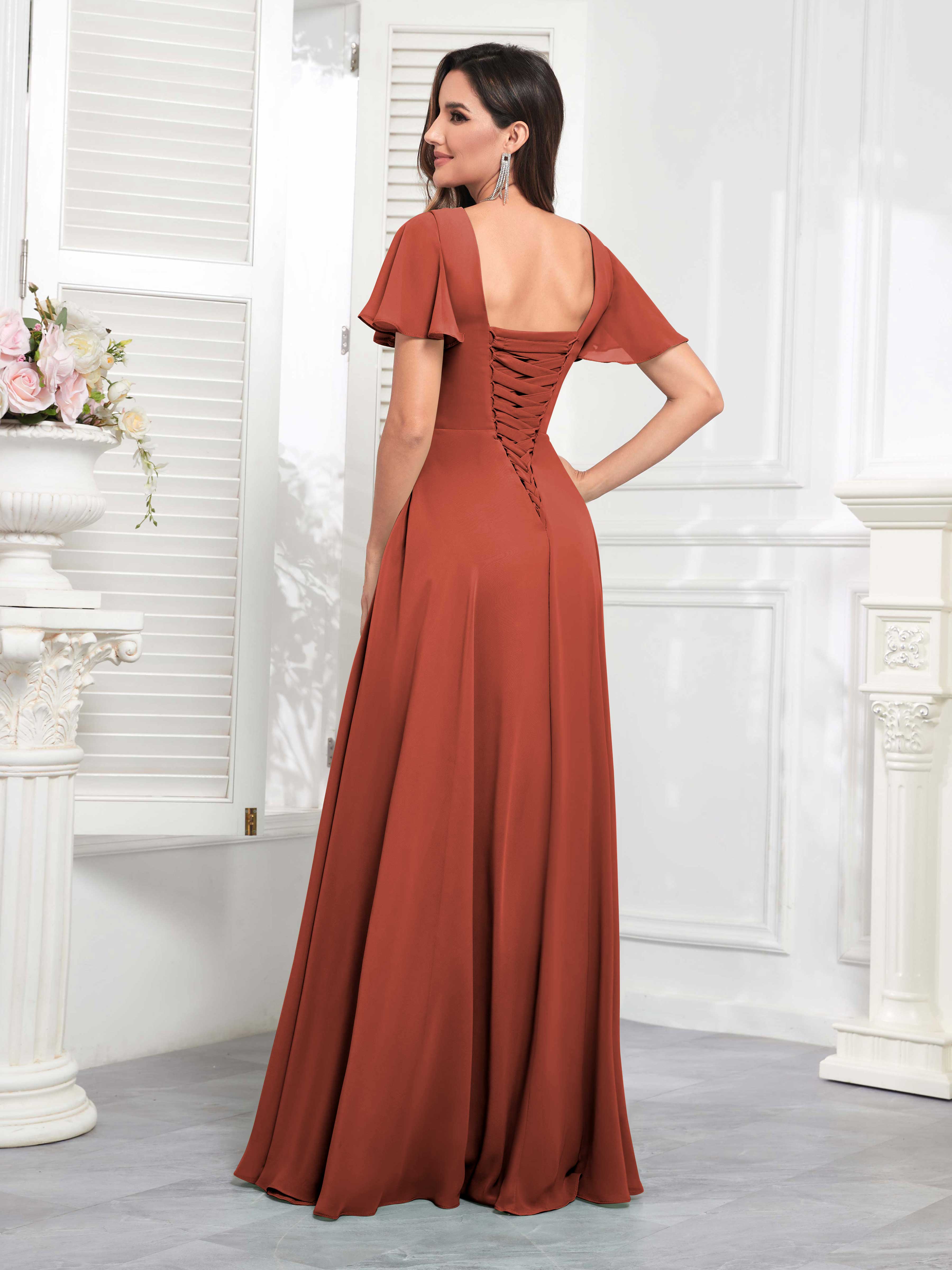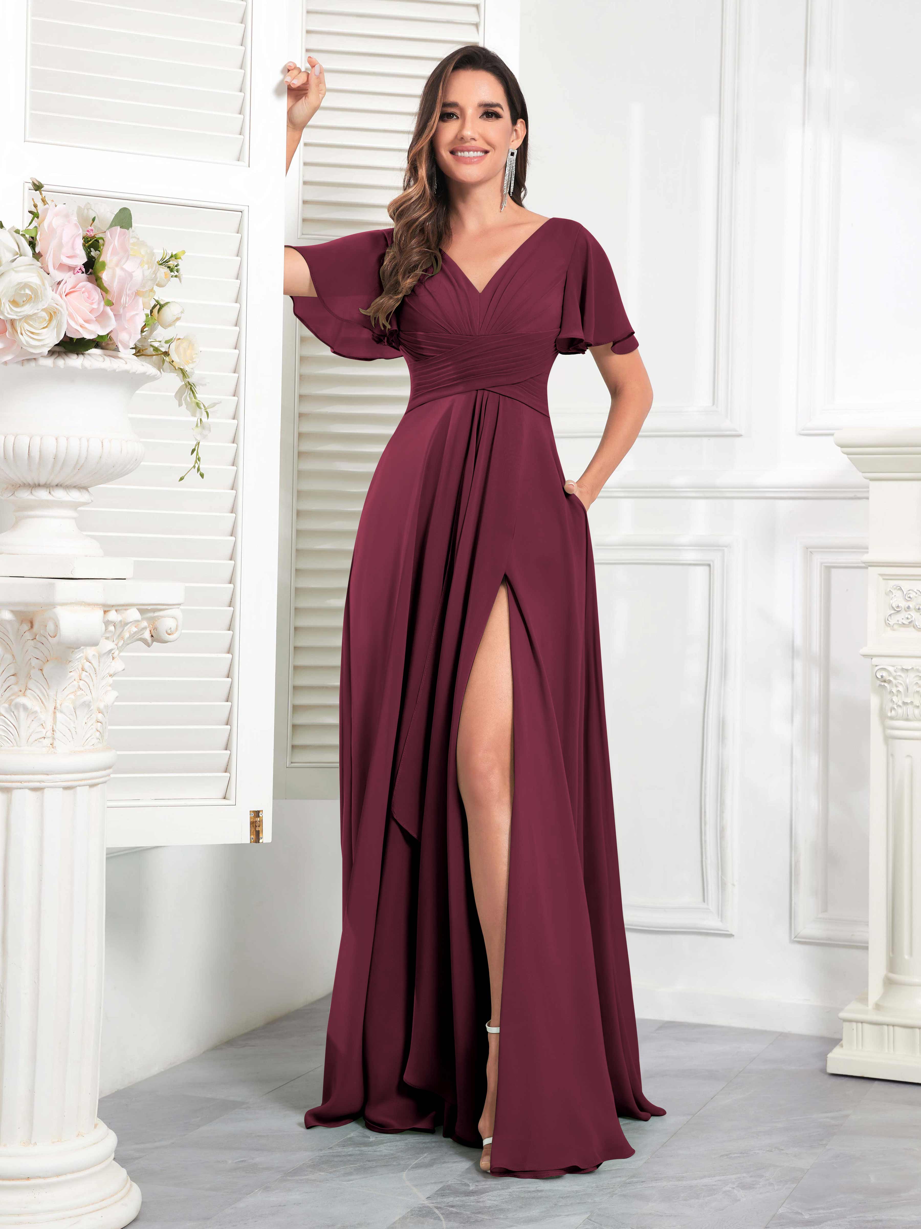 Gracelyn Modest Short Sleeves Ruffles Maxi Chiffon Bridesmaid Dresses
