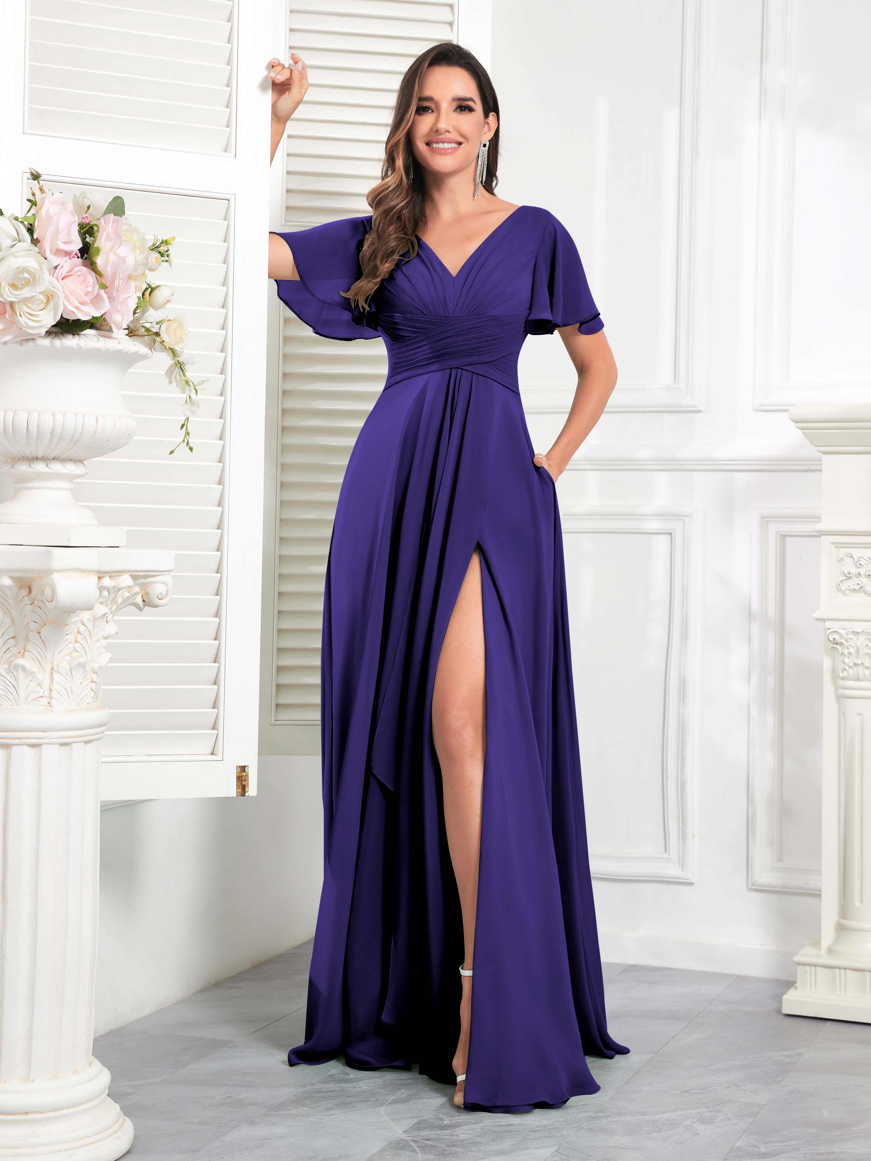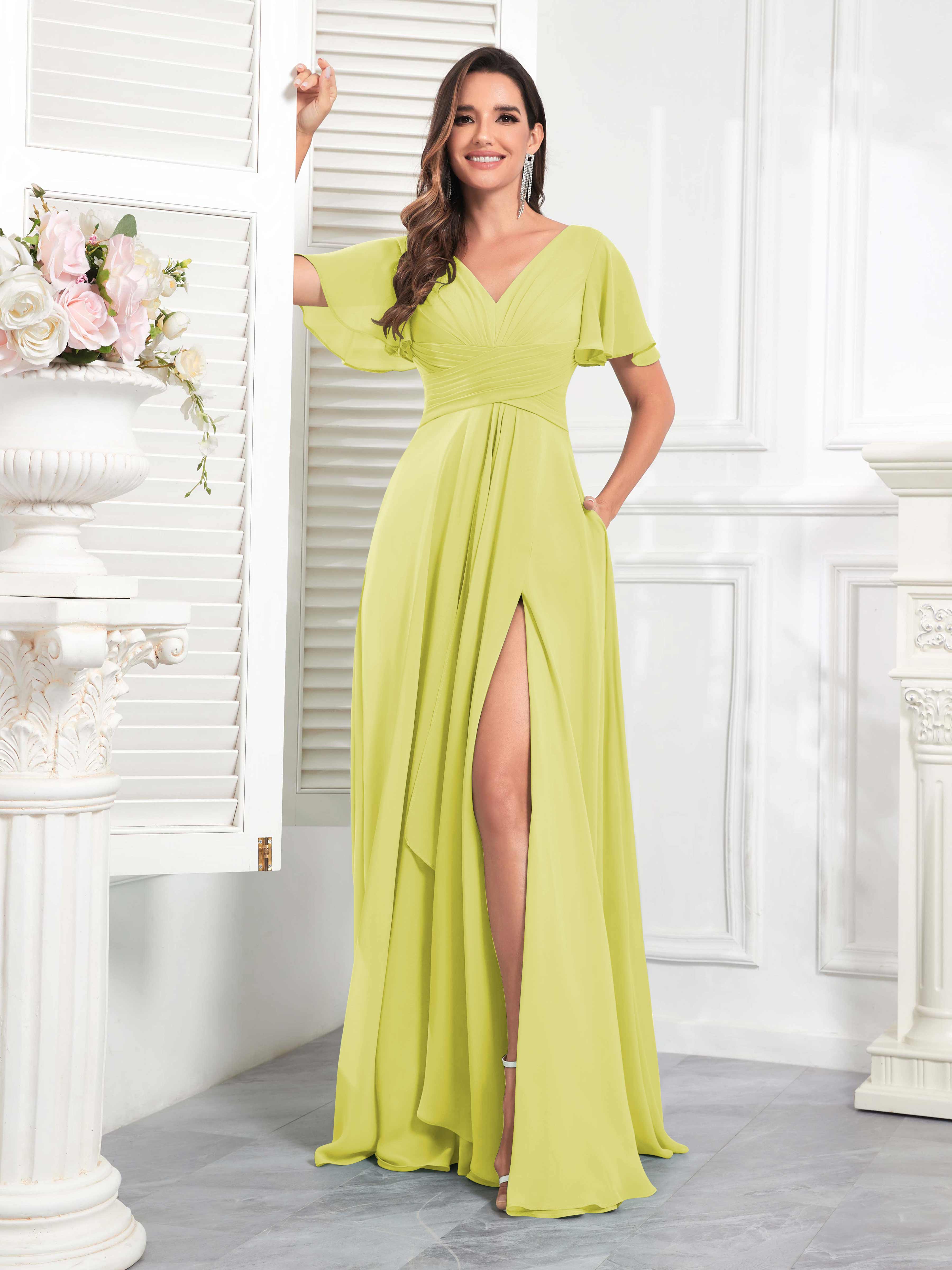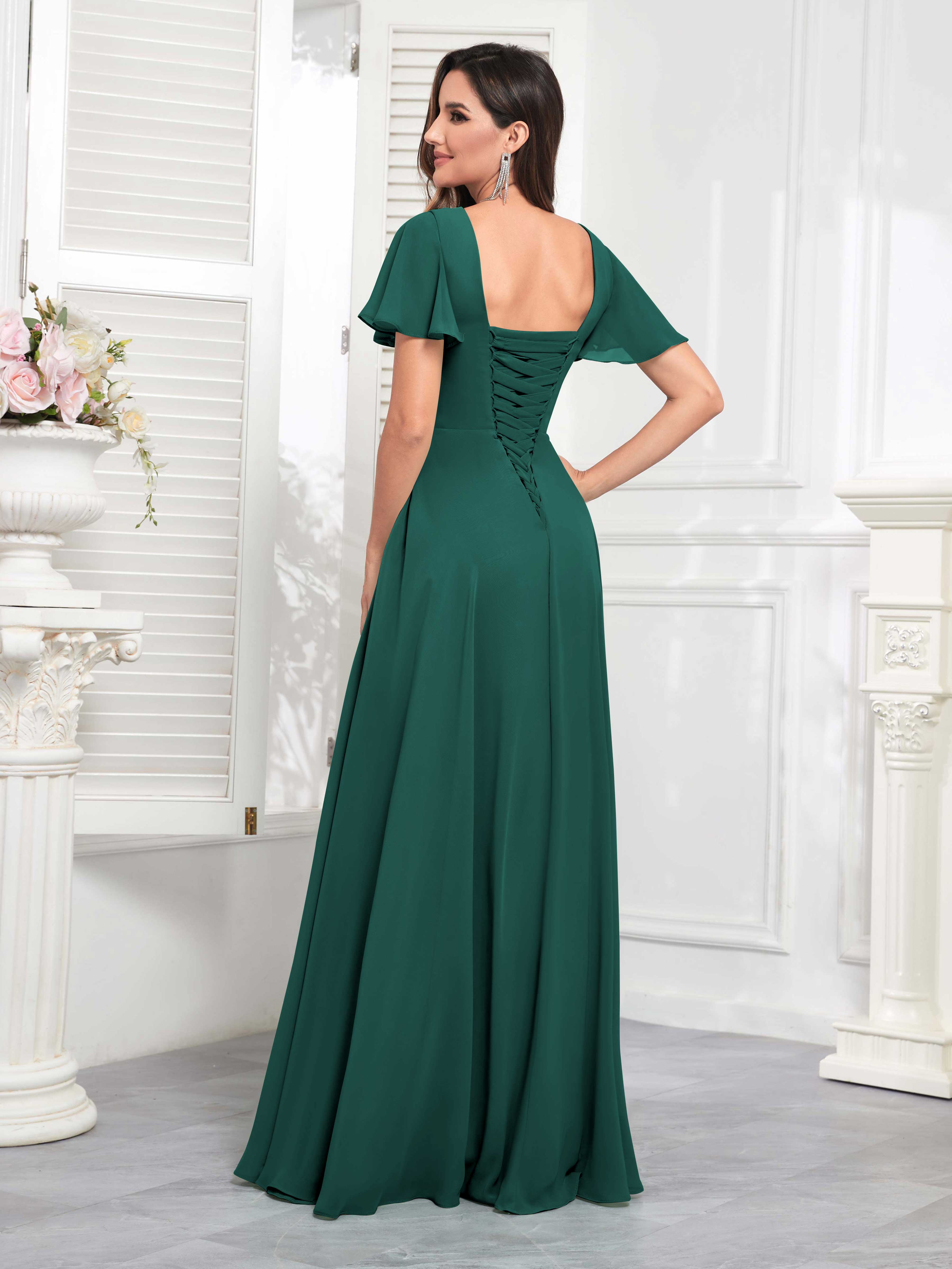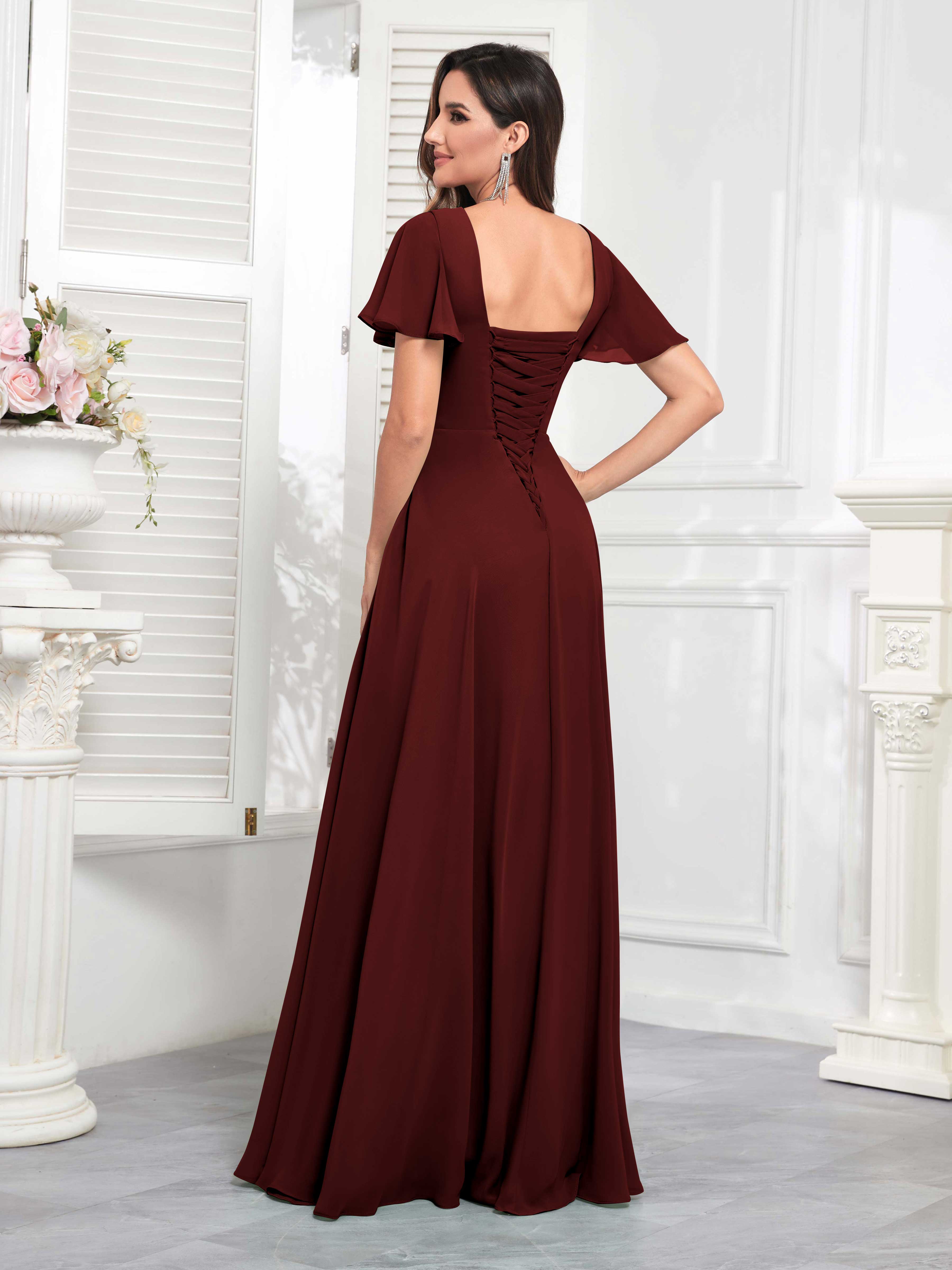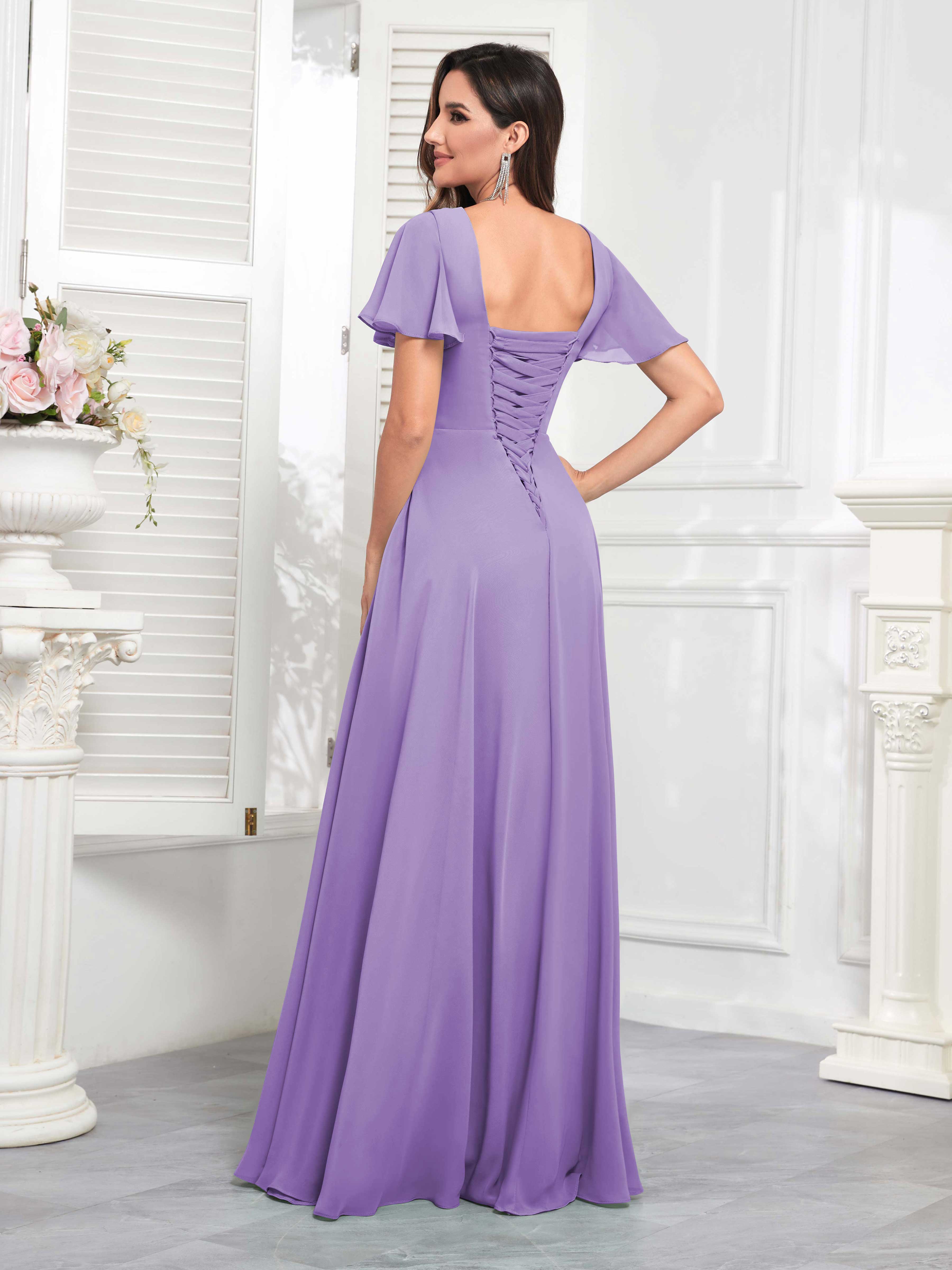 Gracelyn Modest Short Sleeves Ruffles Maxi Chiffon Bridesmaid Dresses