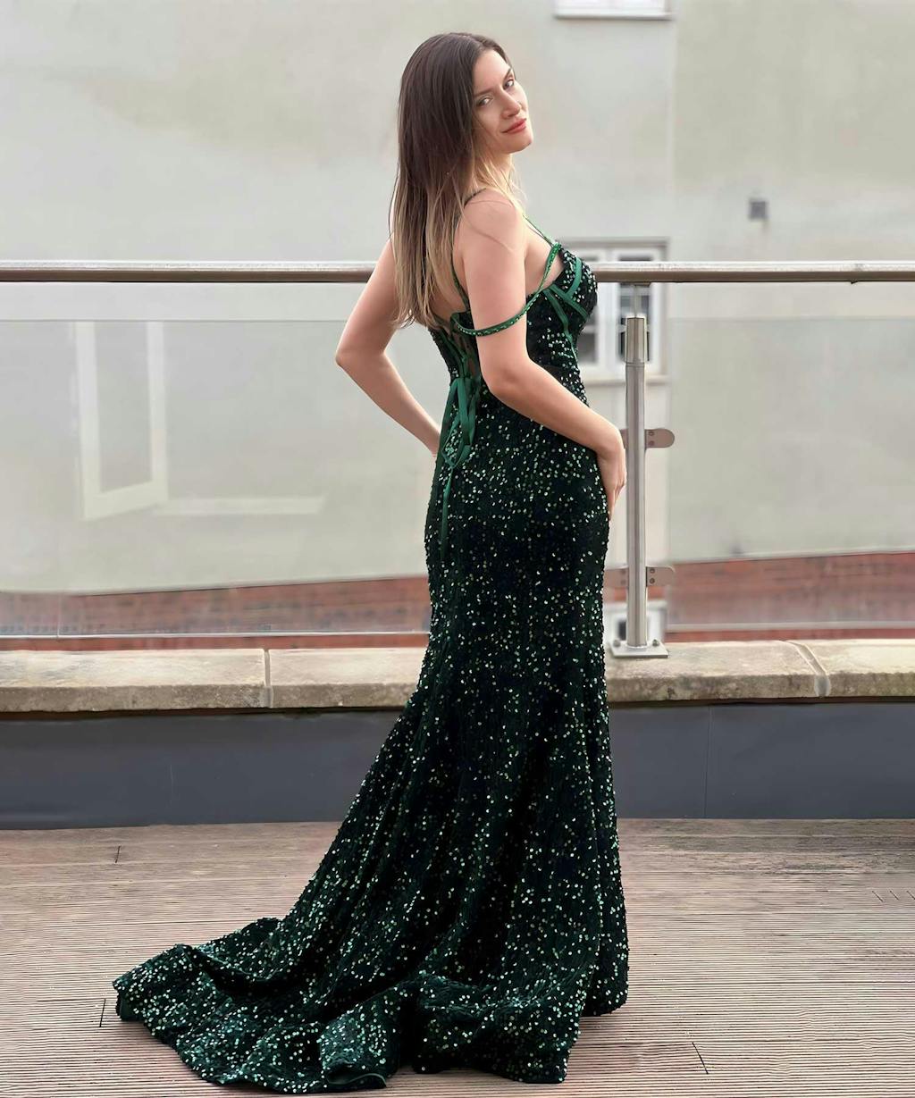 Jade Dazzling Spaghetti Straps Trumpet Brush Train Sequin Dresses