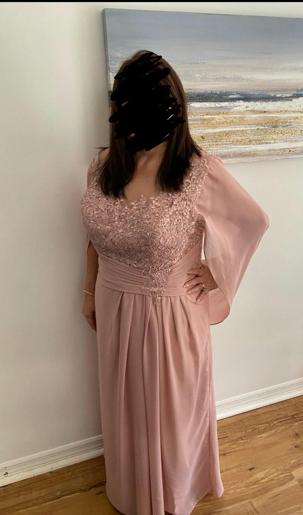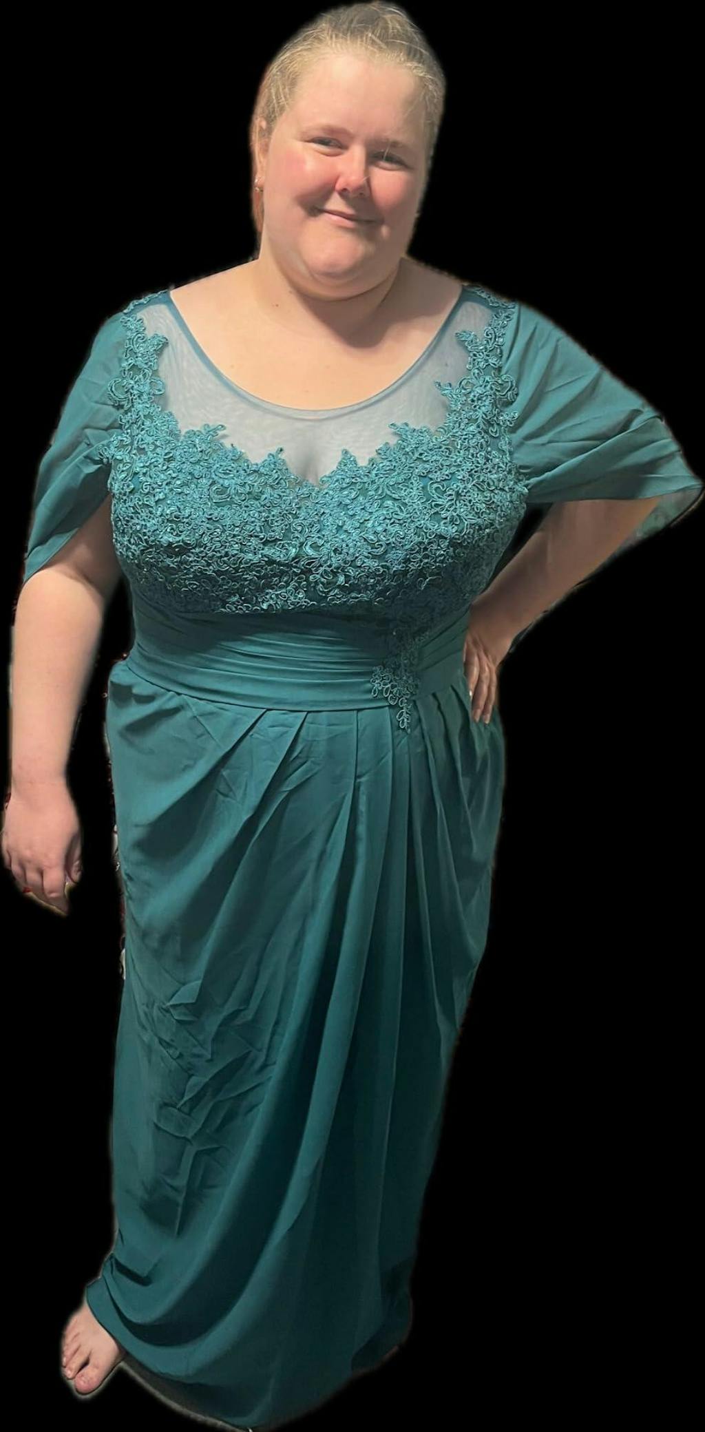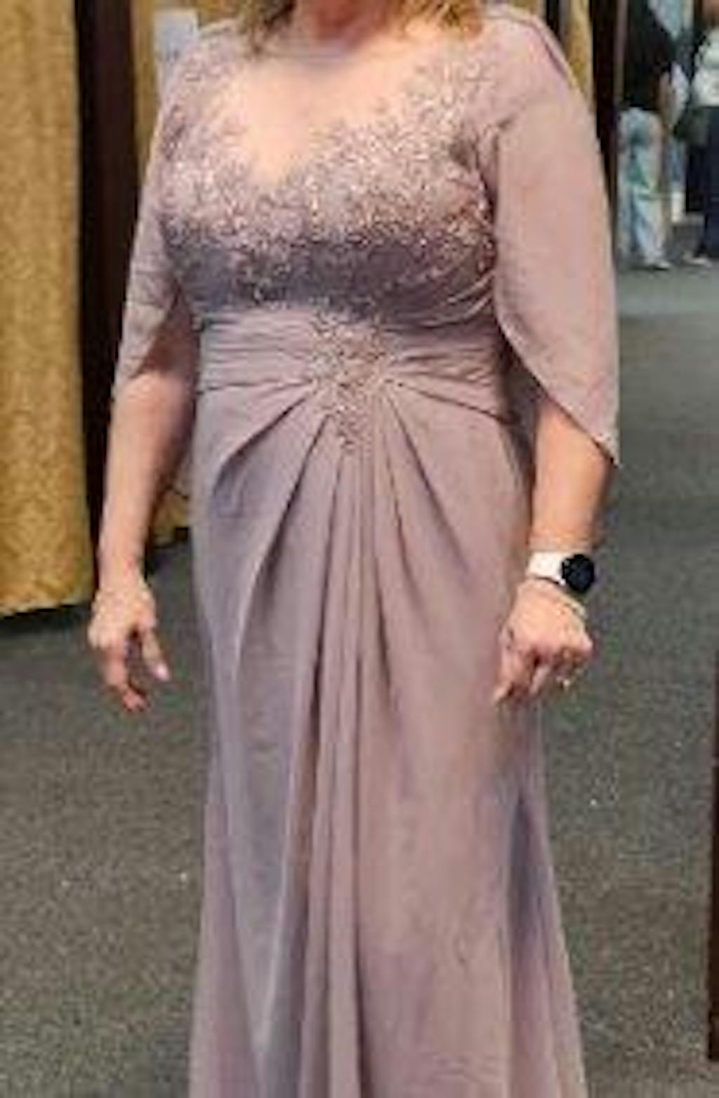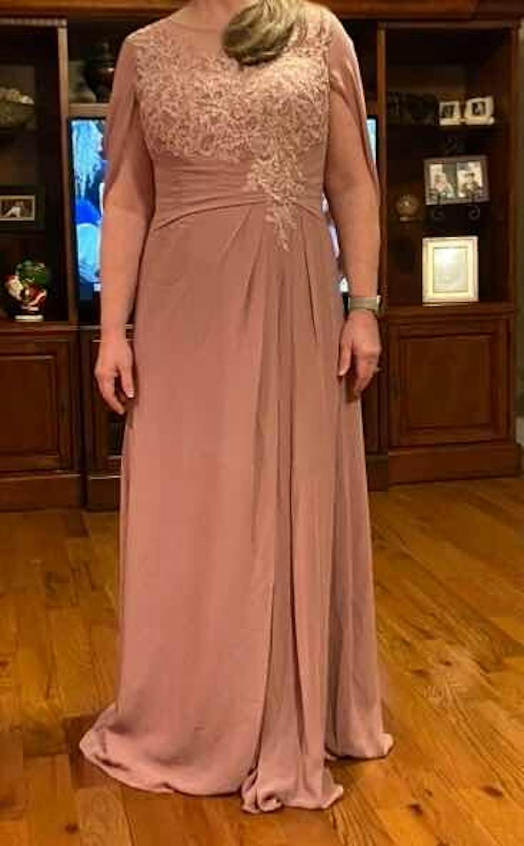 Step into elegance with our Kora Enchanting Mother of the Bride Dress. The ruched cape and lace appliques add a touch of enchantment to the long chiffon silhouette. Feel sophisticated and chic on your special day.