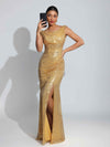 Laelith Glamorous Cowl Ruched Slit Floor Length Sequins Prom Dresses