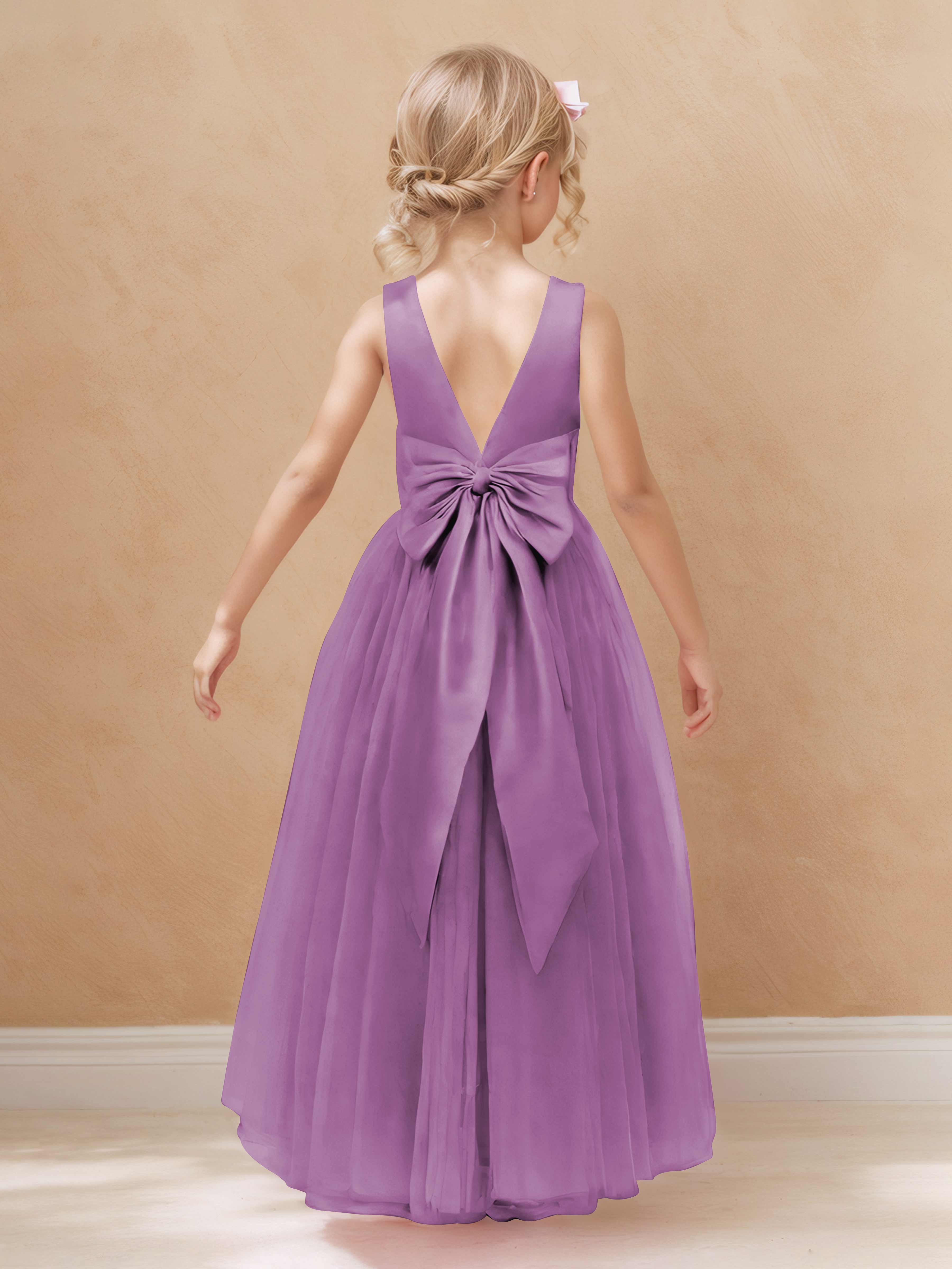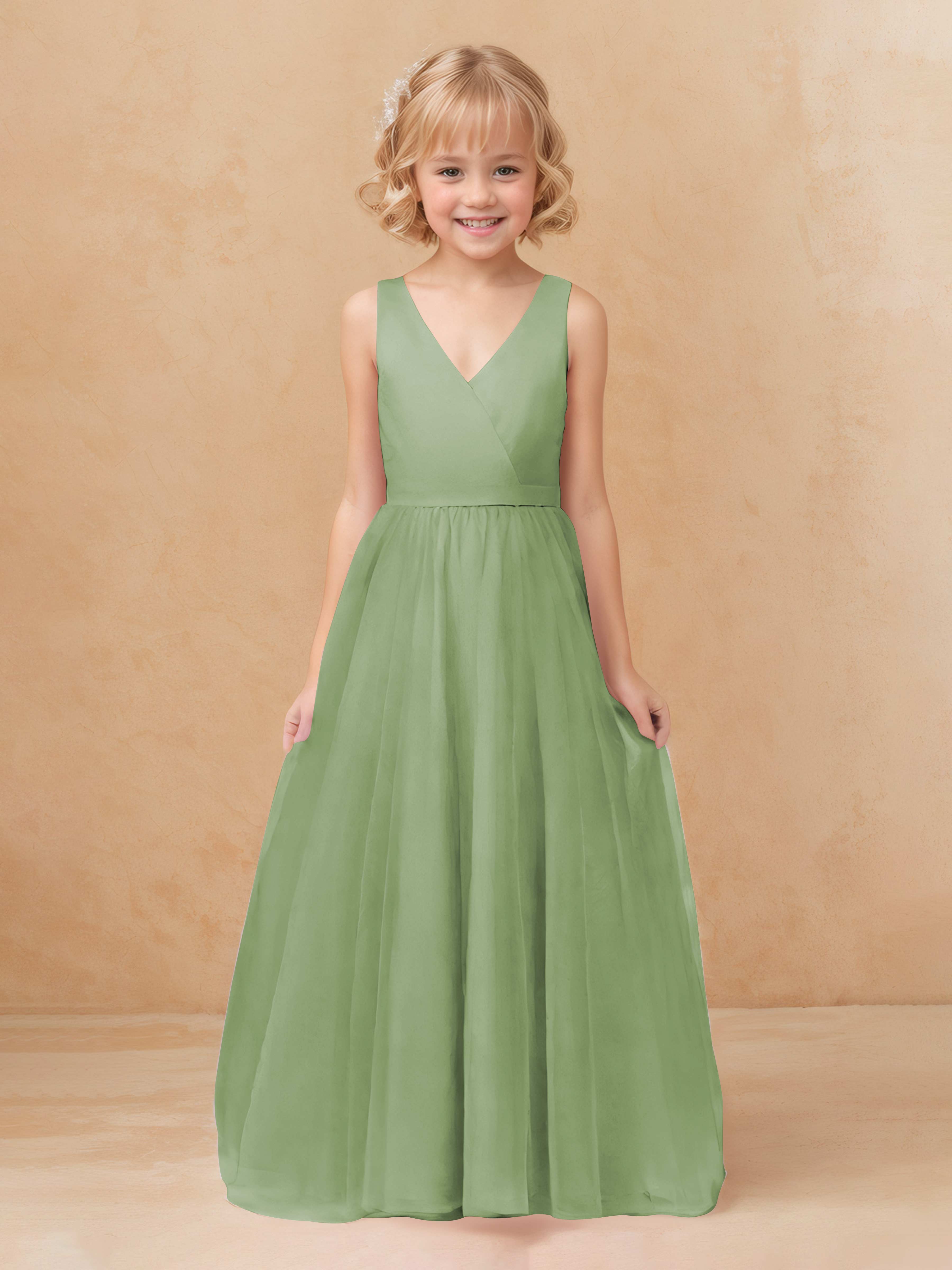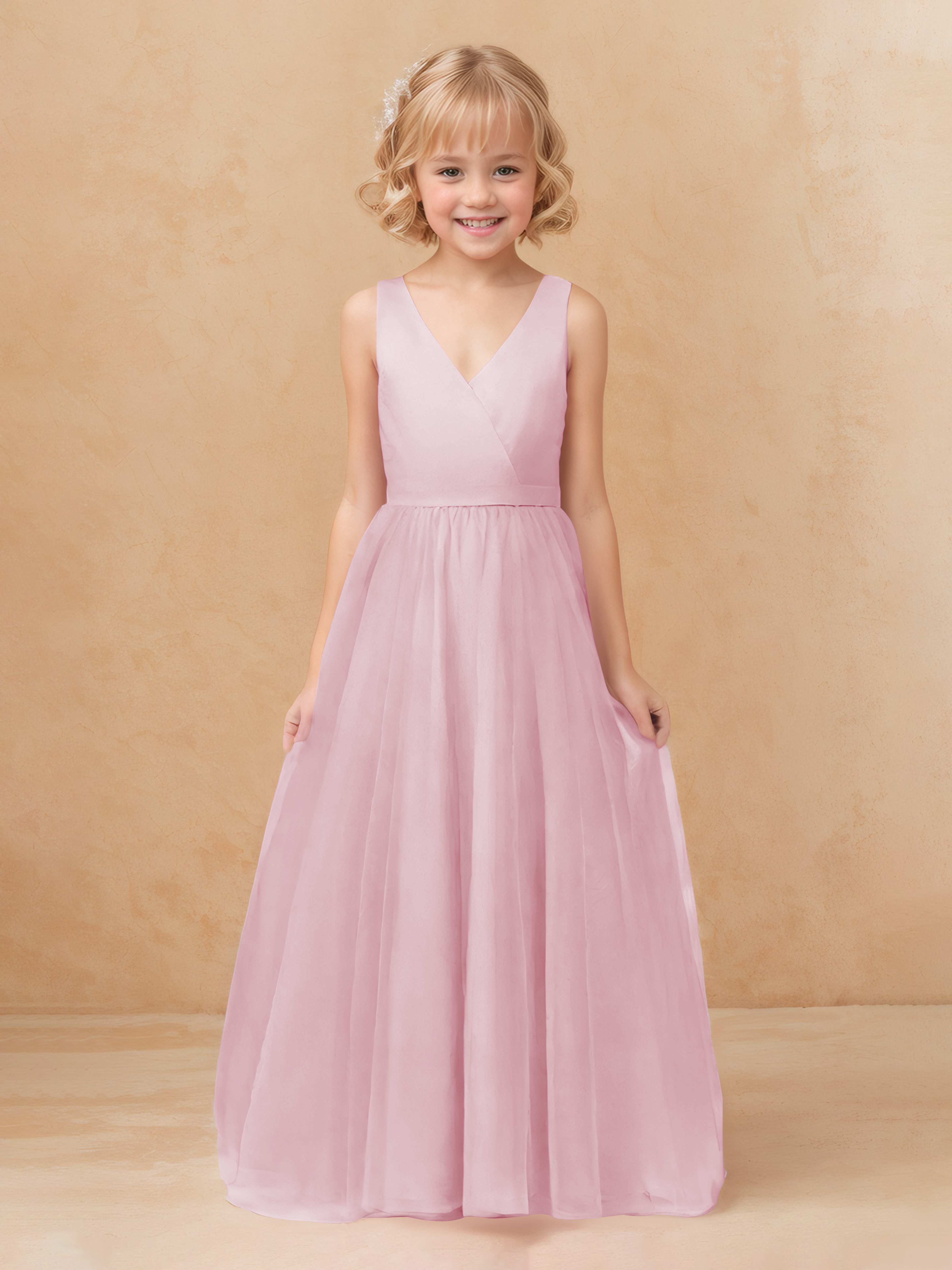 Lovely A-Line V Neck Satin Tulle Long Flower Girl Dresses