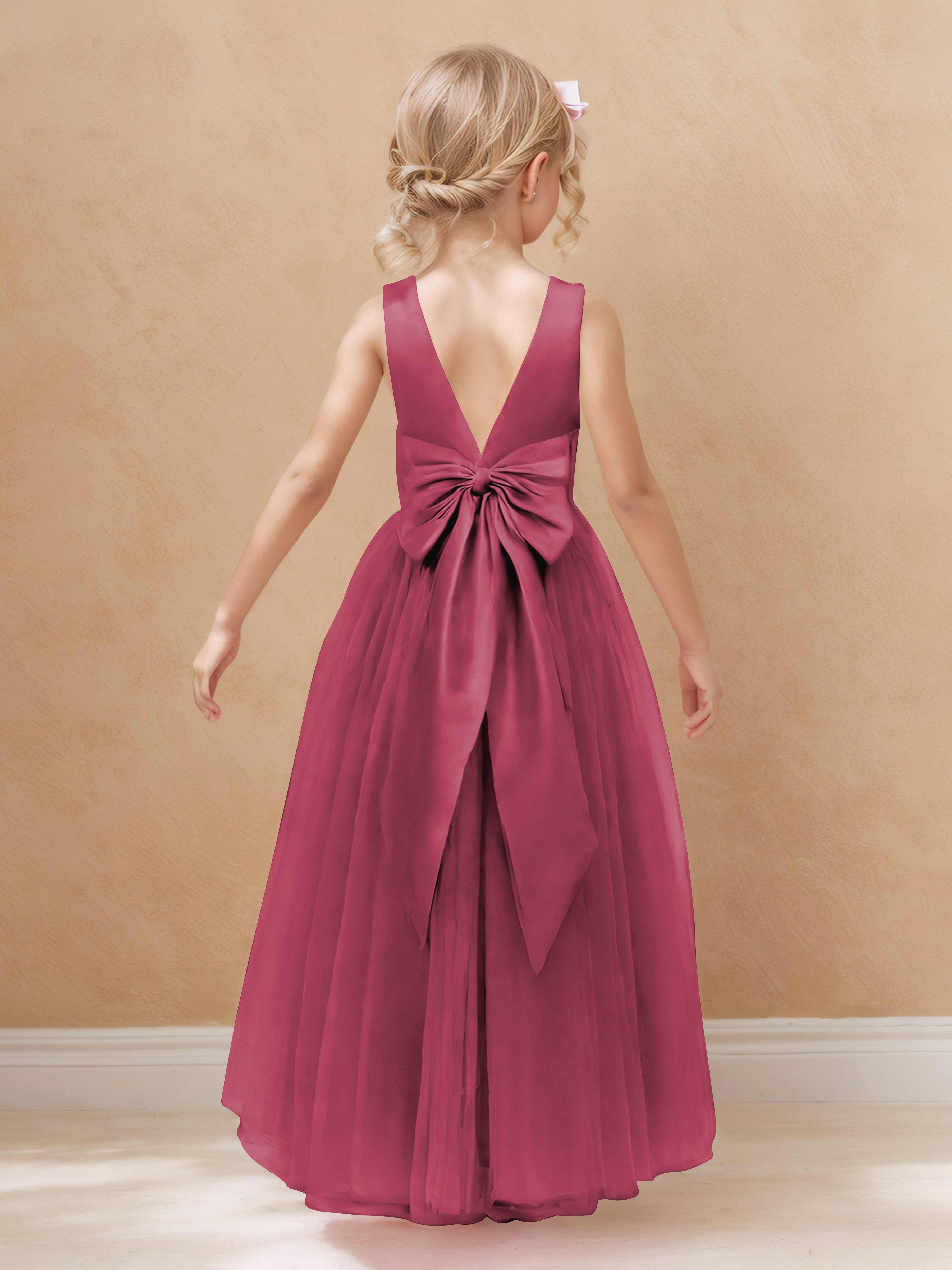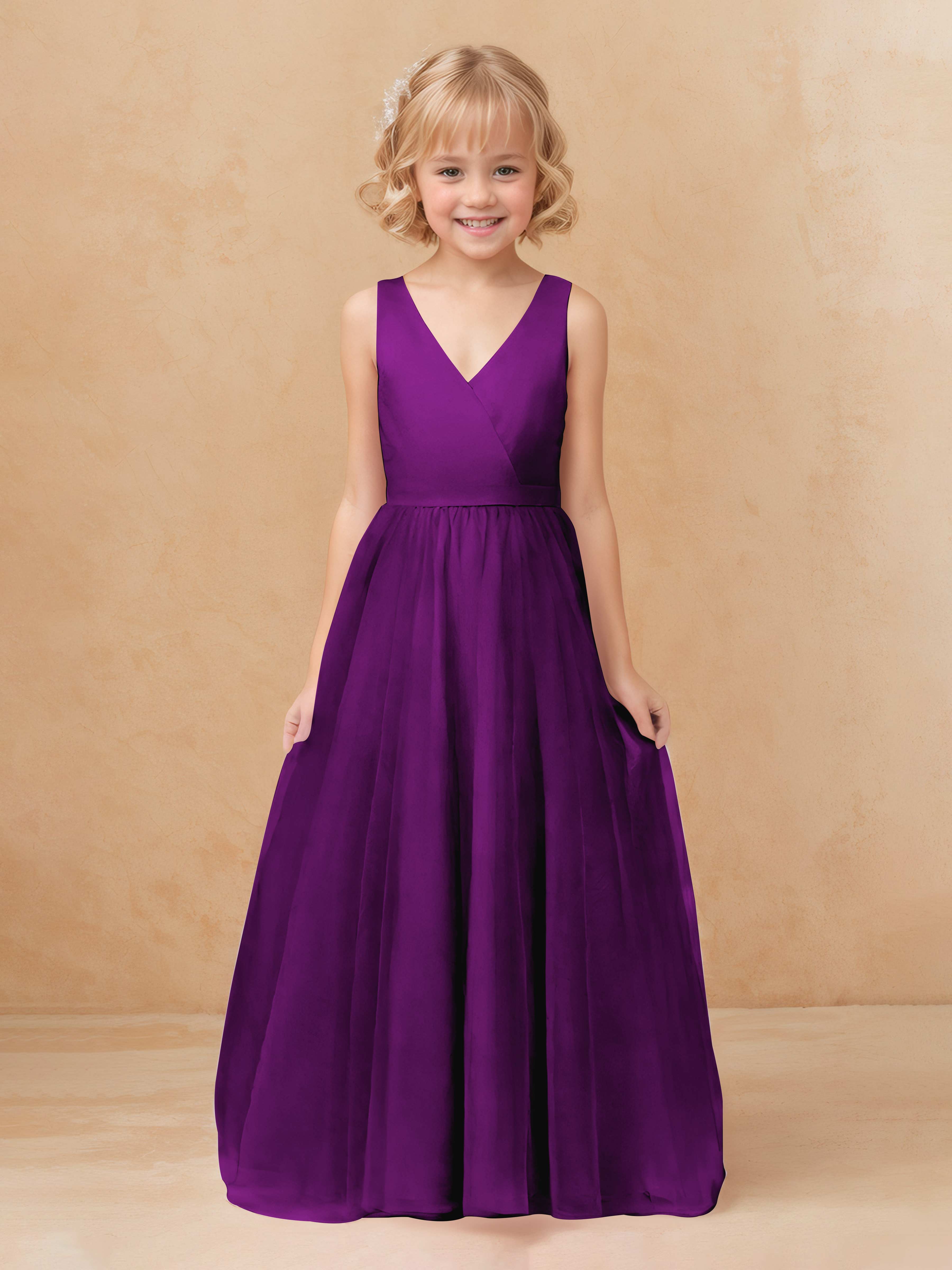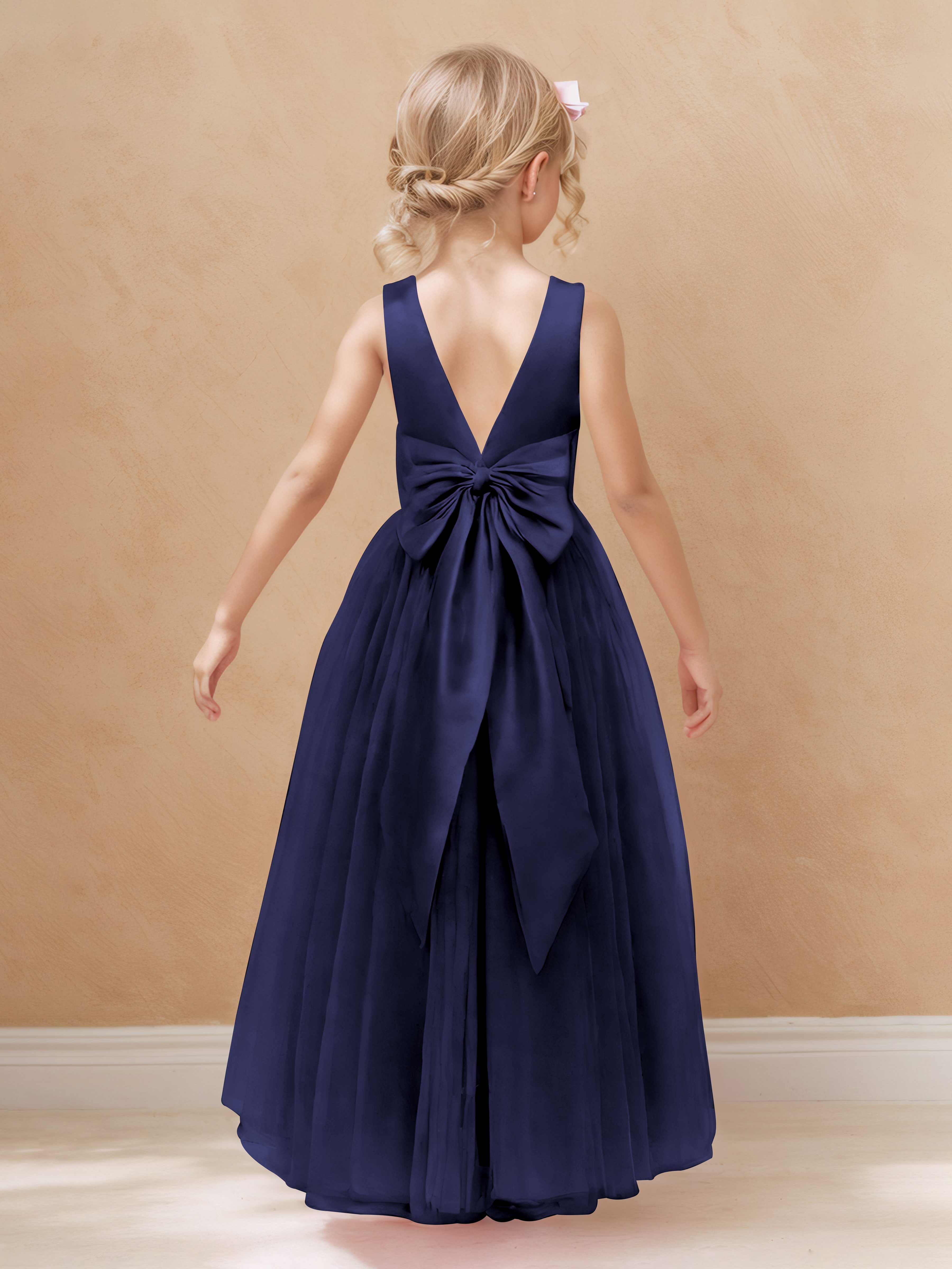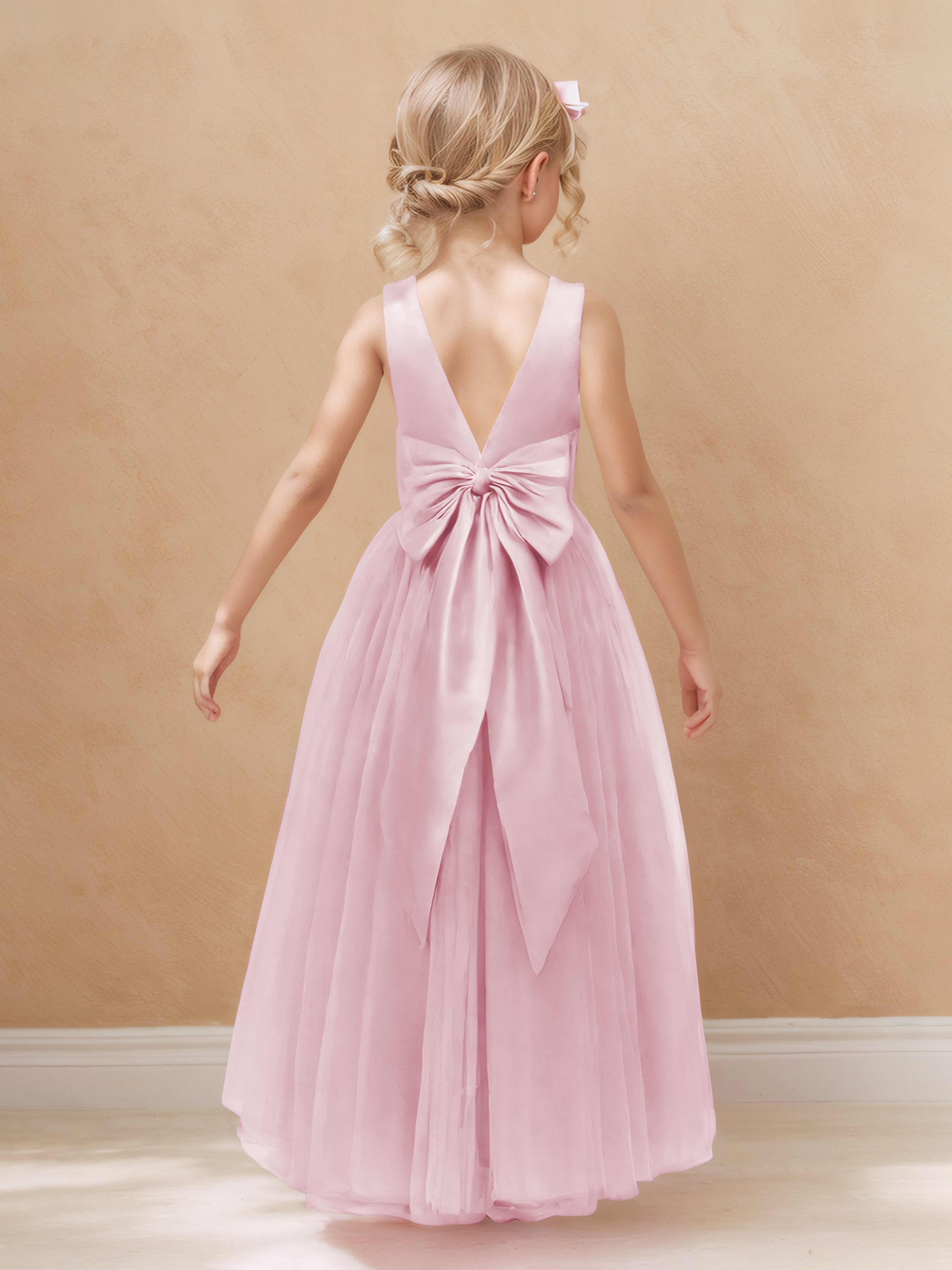 Lovely A-Line V Neck Satin Tulle Long Flower Girl Dresses