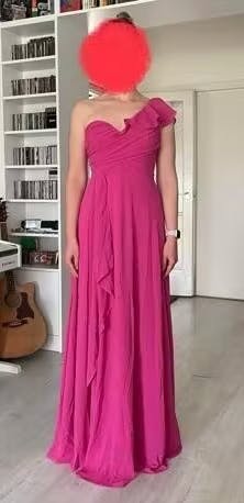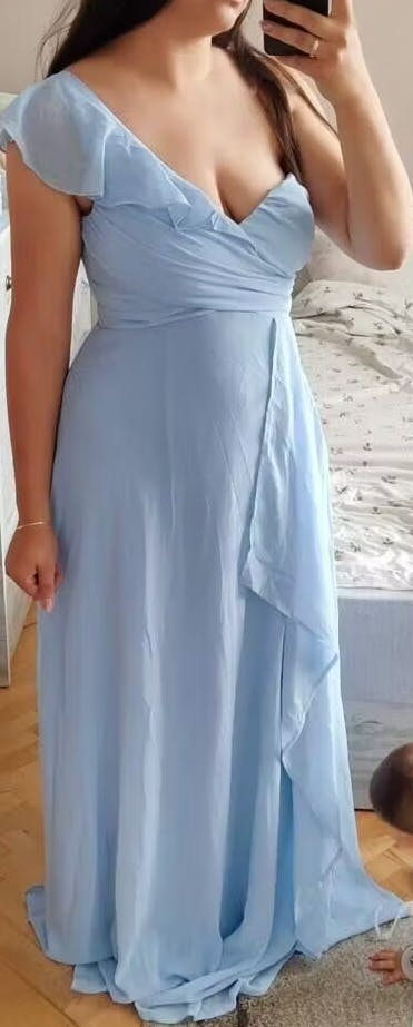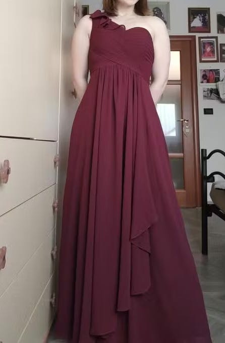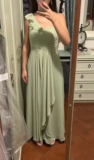 The Madisyn bridesmaid dress offers a flattering one-shoulder design with elegant pleated chiffon that gracefully flows to the floor. Its sophisticated silhouette enhances every wearer’s natural shape, creating a poised and timeless look perfect for any formal occasion.
