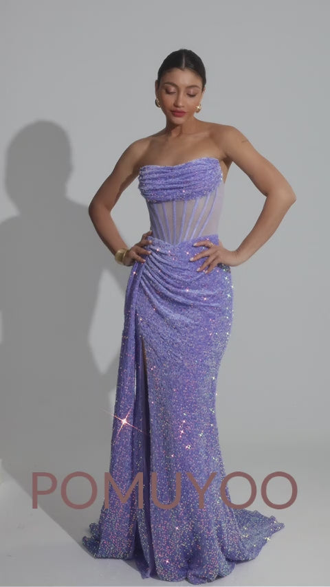 Mraelith Stunning Strapless Corset Slit Velvet Sequins Train Prom Dresses