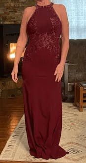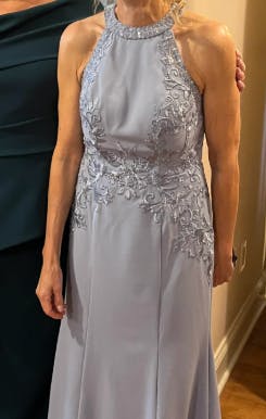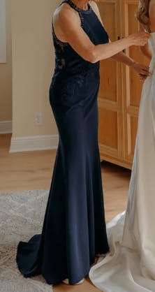 Crafted from intricate lace, this long gown exudes sophistication perfect for a mother of the bride who commands attention. Paired with a complementary jacket, it offers poised versatility, ensuring you stay graceful and unforgettable throughout the celebration.