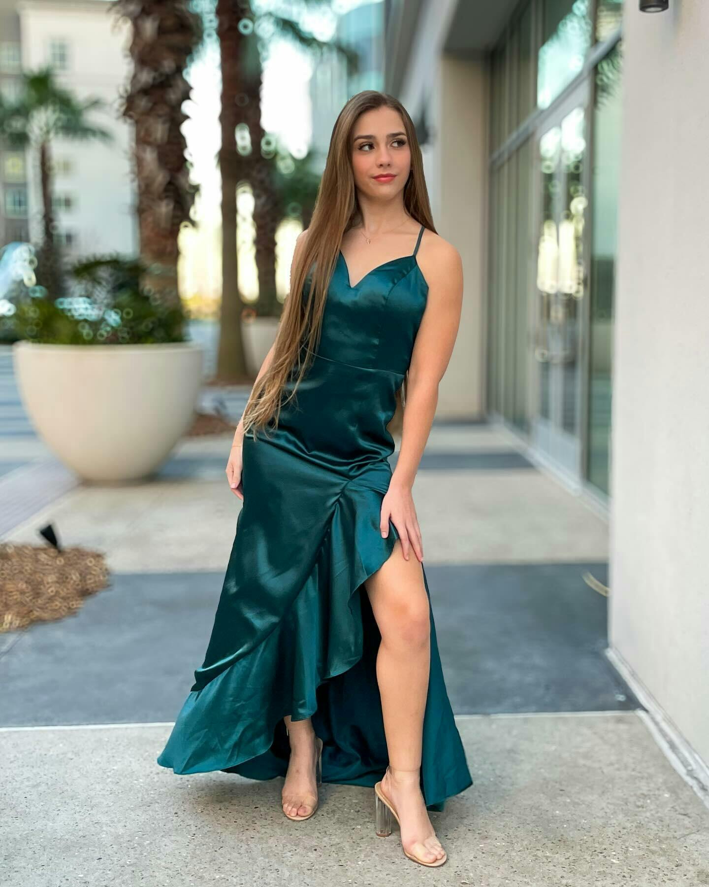 Octavia Simple Spaghetti Straps Ruffles Sweep Train Satin Dresses