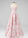 Pink A-Line Strapless Pearl Jacquard Satin Long Prom Dresses