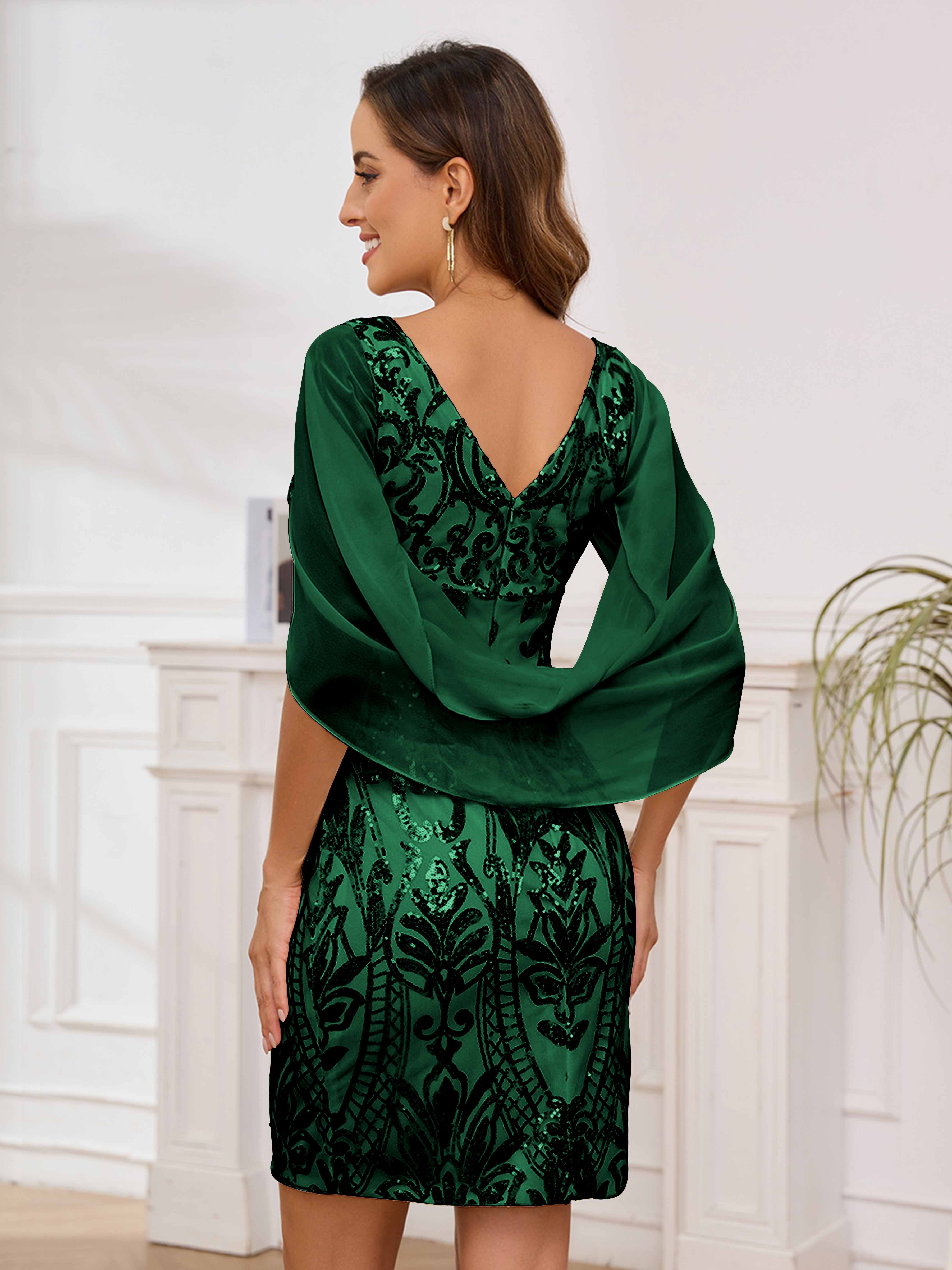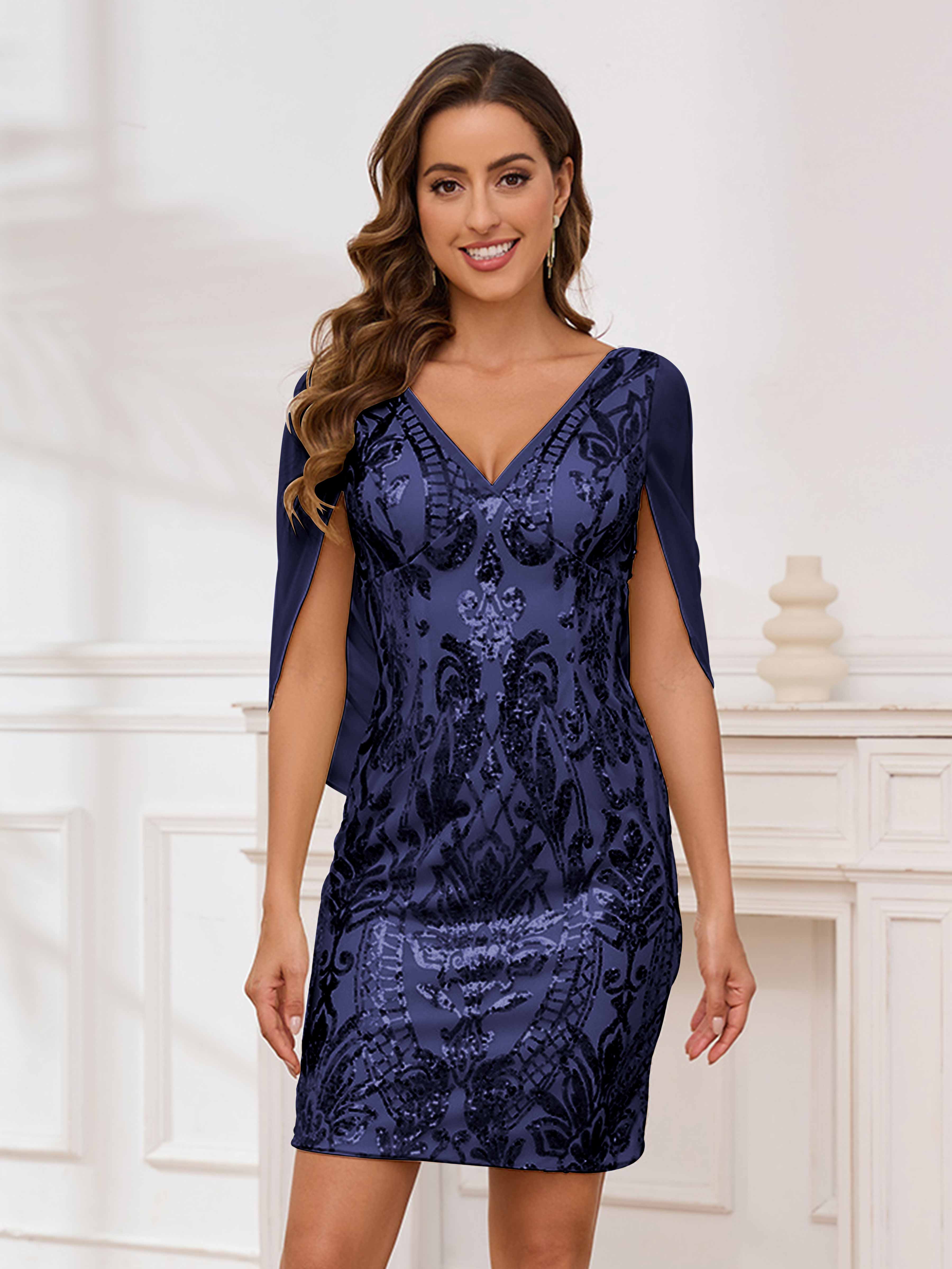 Renata Chic V Neck Cape Sleeves Sheath Short Sequins Occasion Dresses