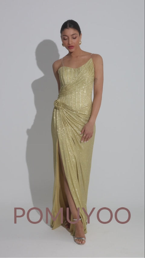 Saelith Stunning Sheath One Shoulder Flower Pleated Slit Long Glitter Prom Dresses